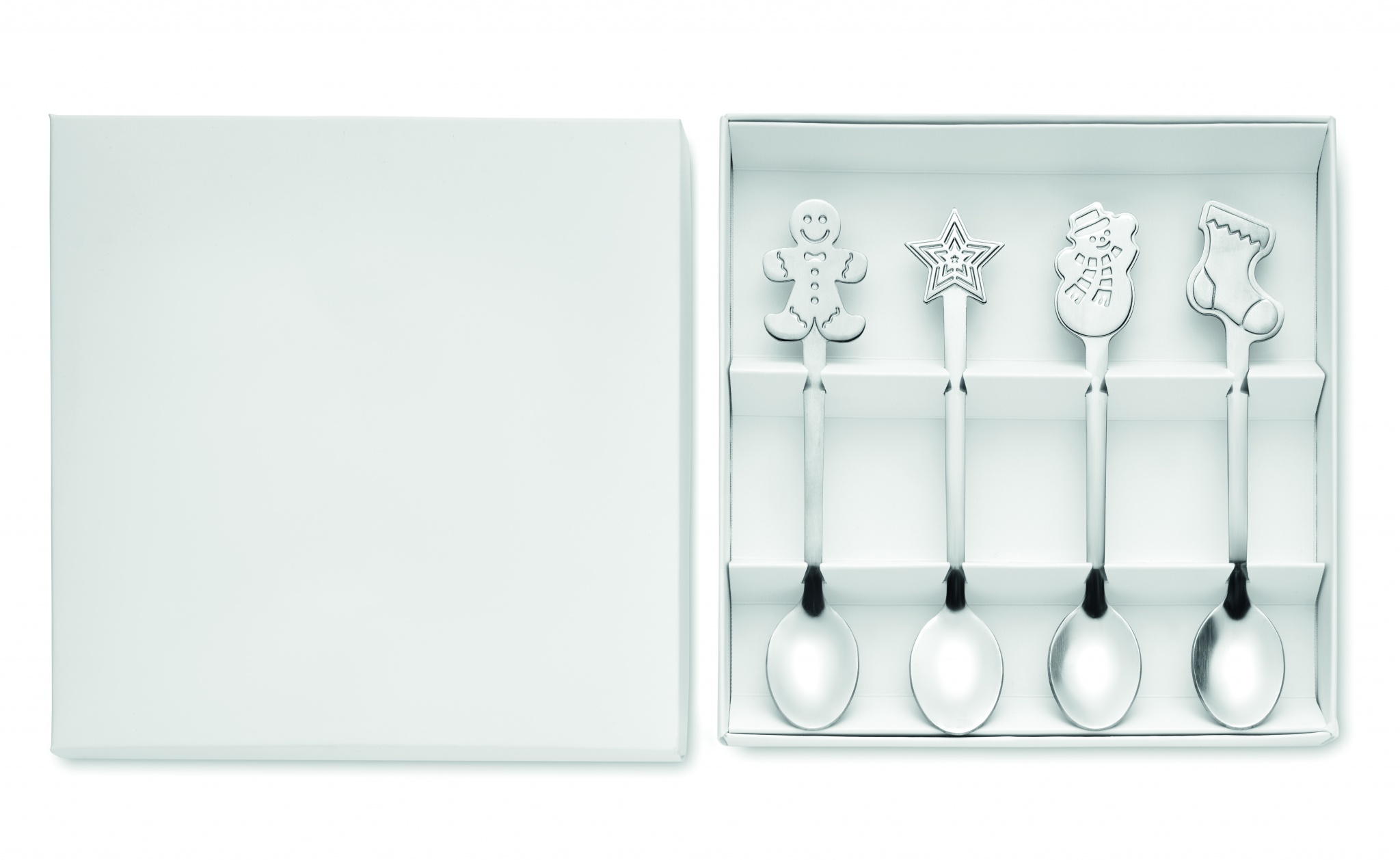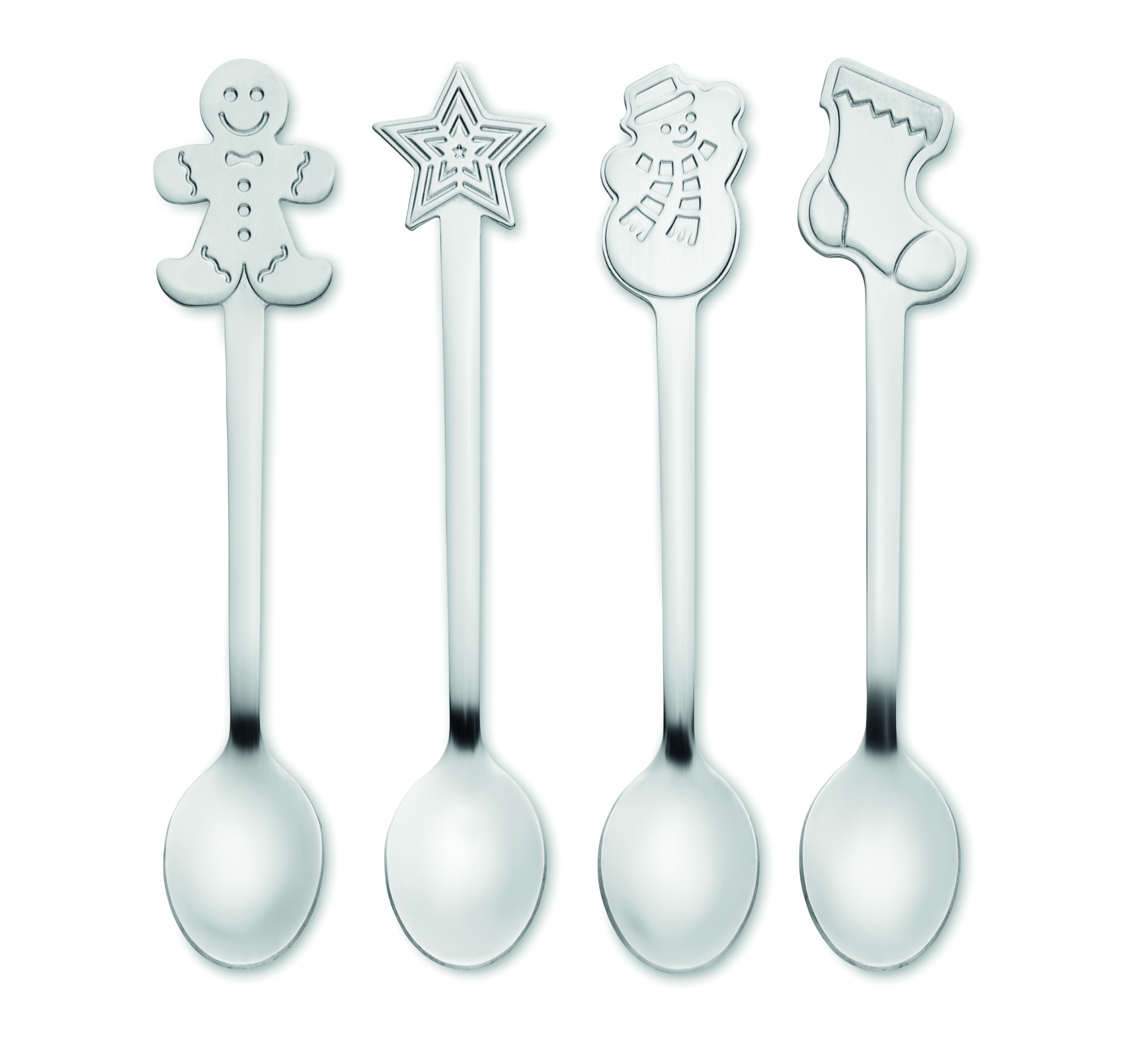 Set mit 4 Teelöffeln mit unterschiedlichen weihnachtlichen Motiven. Edelstahl. Lieferung in Geschenkbox.