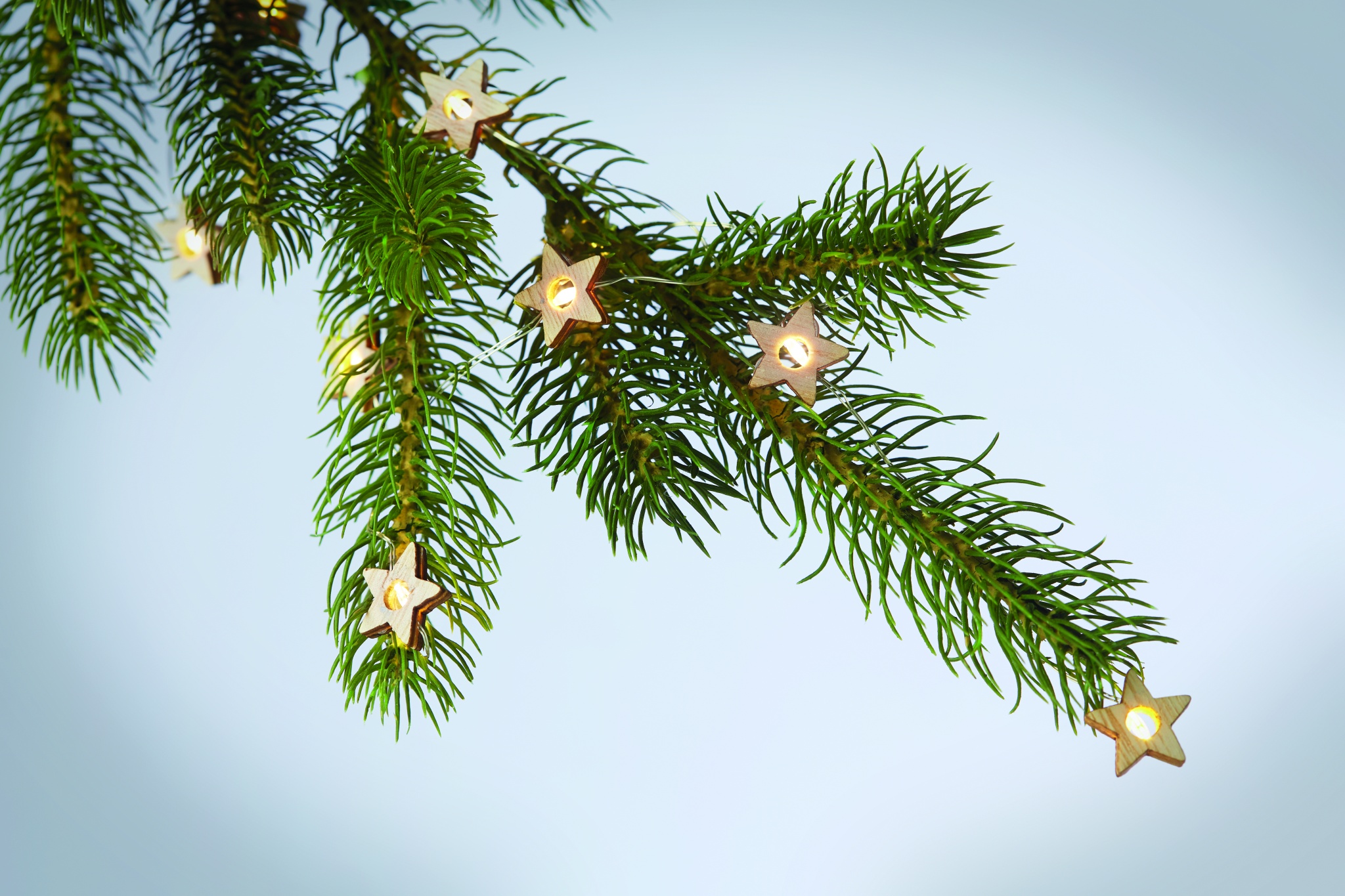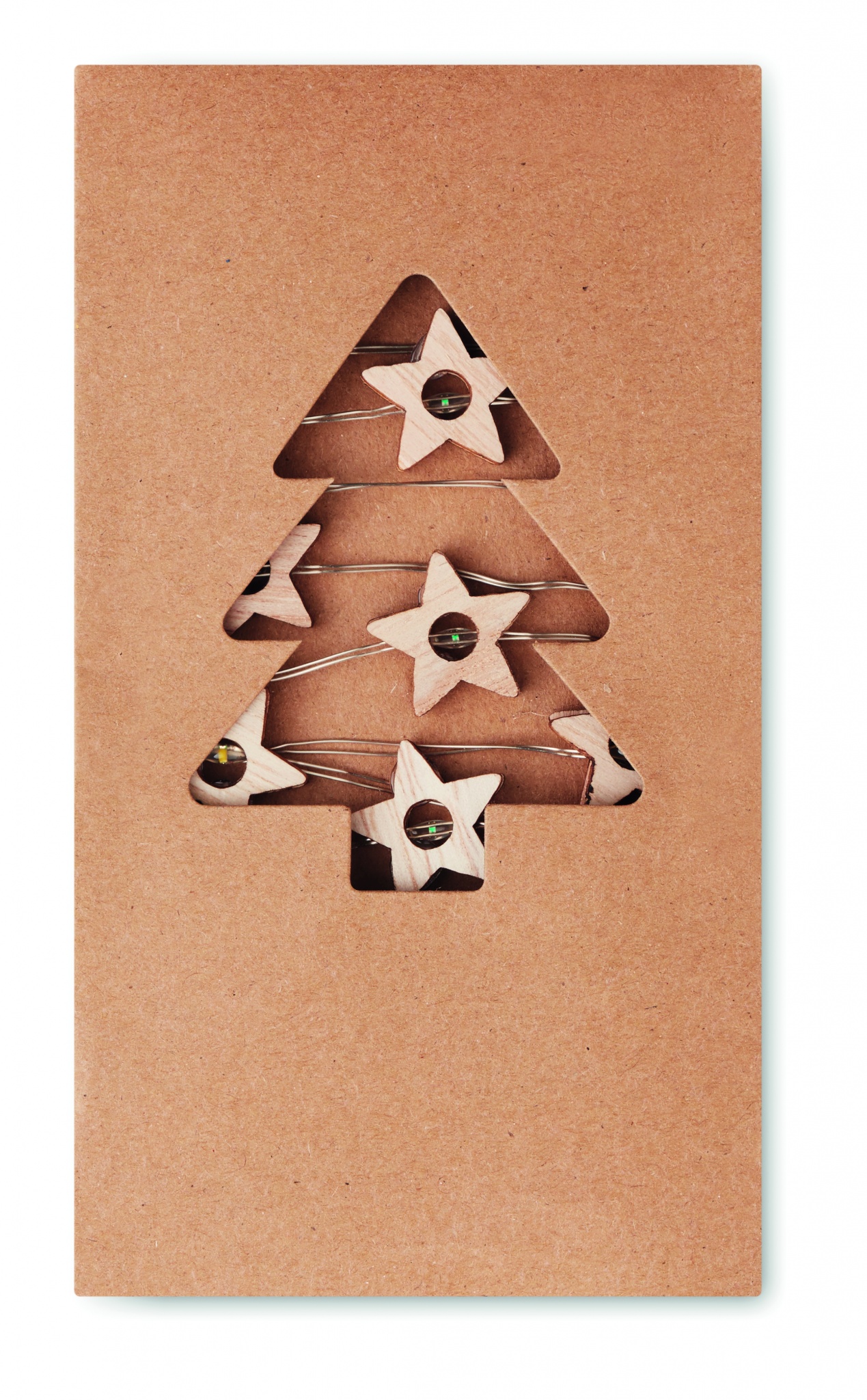 Lichterstrang mit Holzsternen und 20 LED-Lichtern. Der Ein/Ausschalter befindet sich im Batteriefach. Verpackt im kleinen Karton. Exkl. 2 AA Batterien.