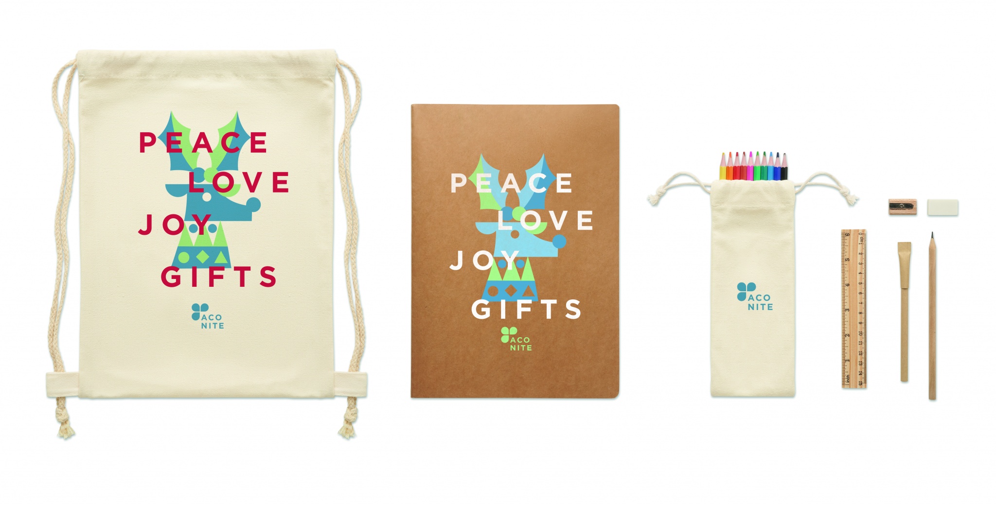 Zeichen-Set für Kinder. Beinhaltet 1 Holzlineal, 1 Anspitzer, Radiergummi, Holzbleistift, Kugelschreiber, 10 Buntstifte, 50 Blatt (100 Seiten) DIN A4-Recyclingpapier. Lieferung im Beutel aus Baumwolle mit Kordelzug.