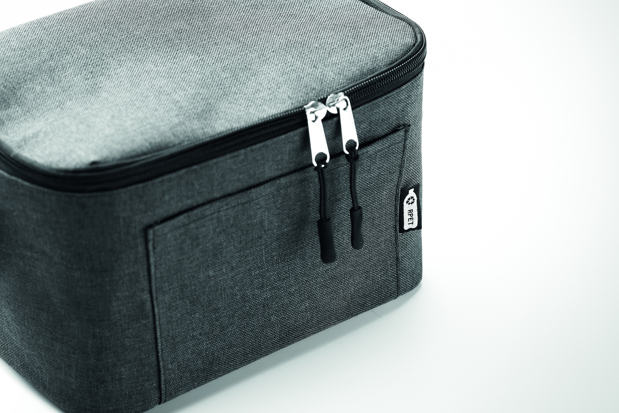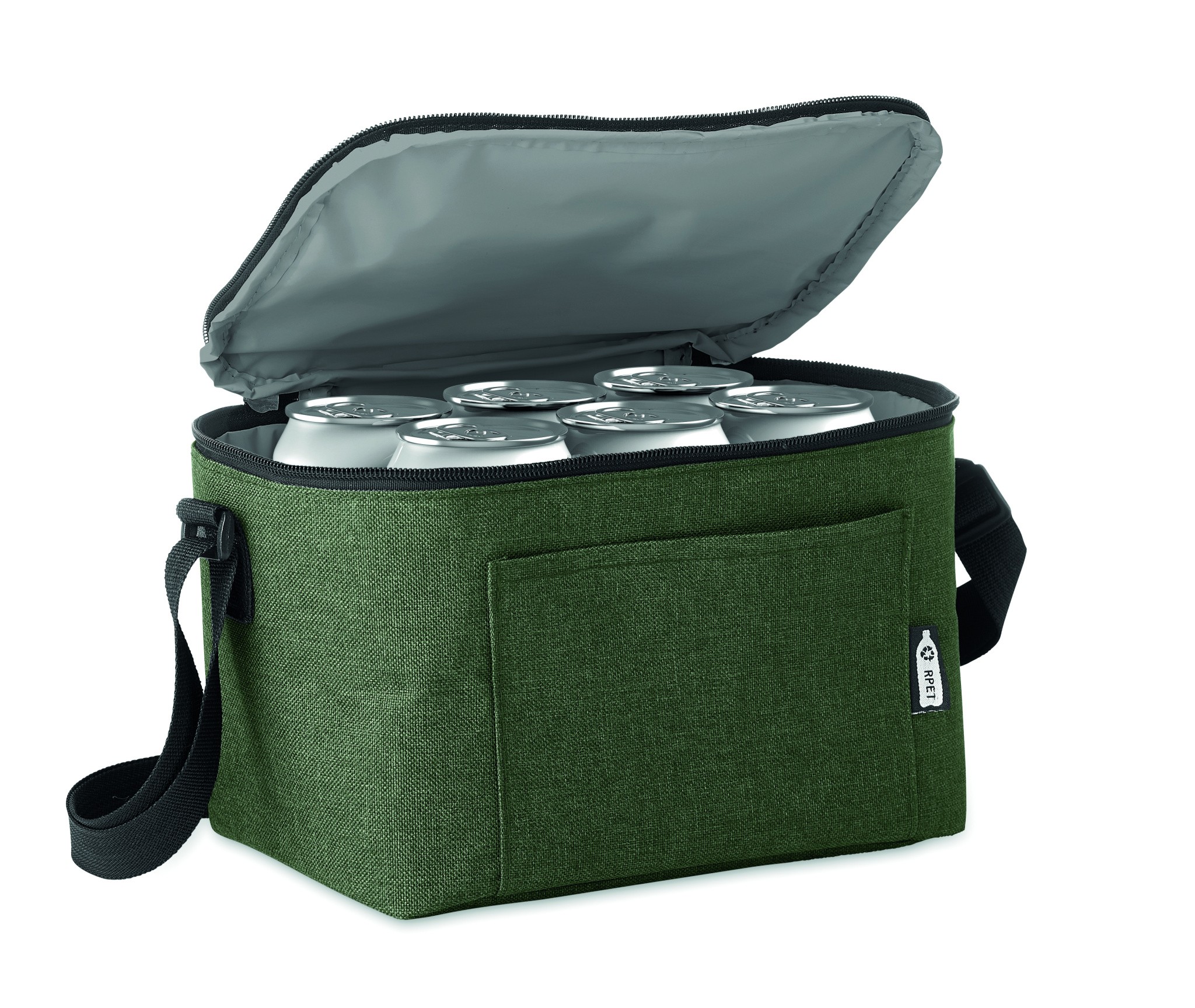Cooler bag for 6 cans in 2 tone 600D RPET and front pocket. Capacity 3L. Isolation material: 0.15mm PEVA + 3mm foam.