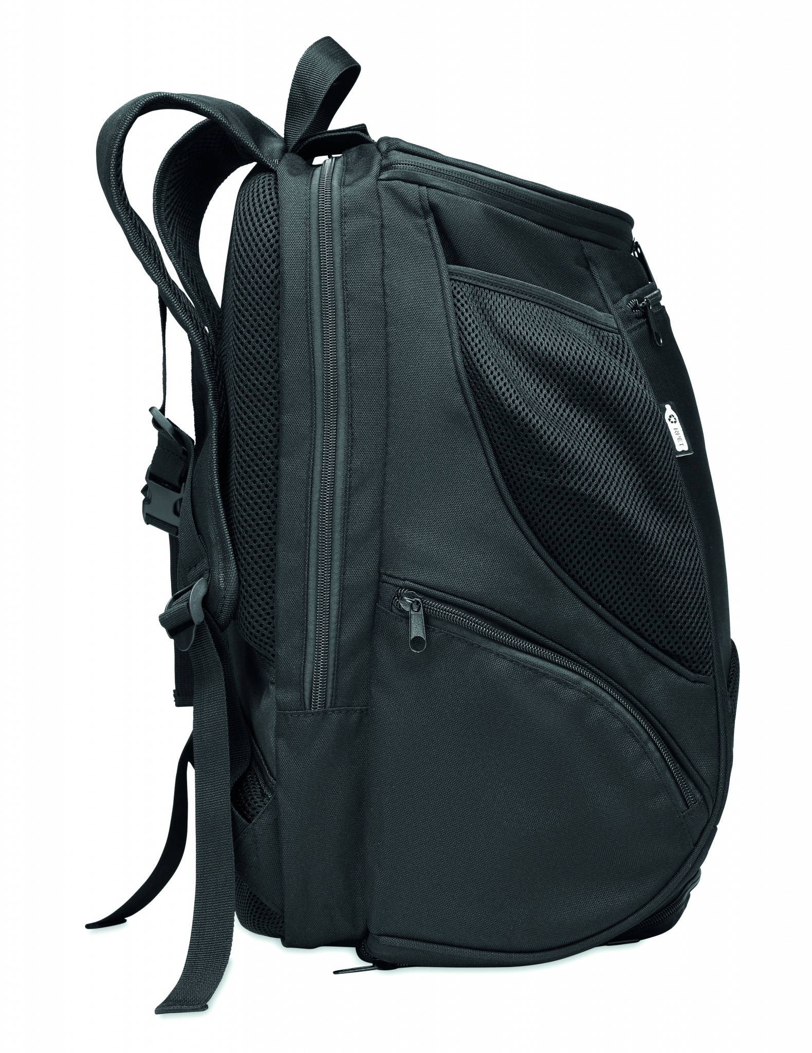 Multifunctional 600D RPET sports rucksack with several compartments (including padded compartment for paddle racket). Includes adjustable shoulder strap.