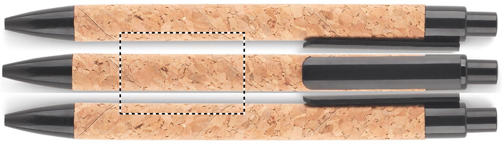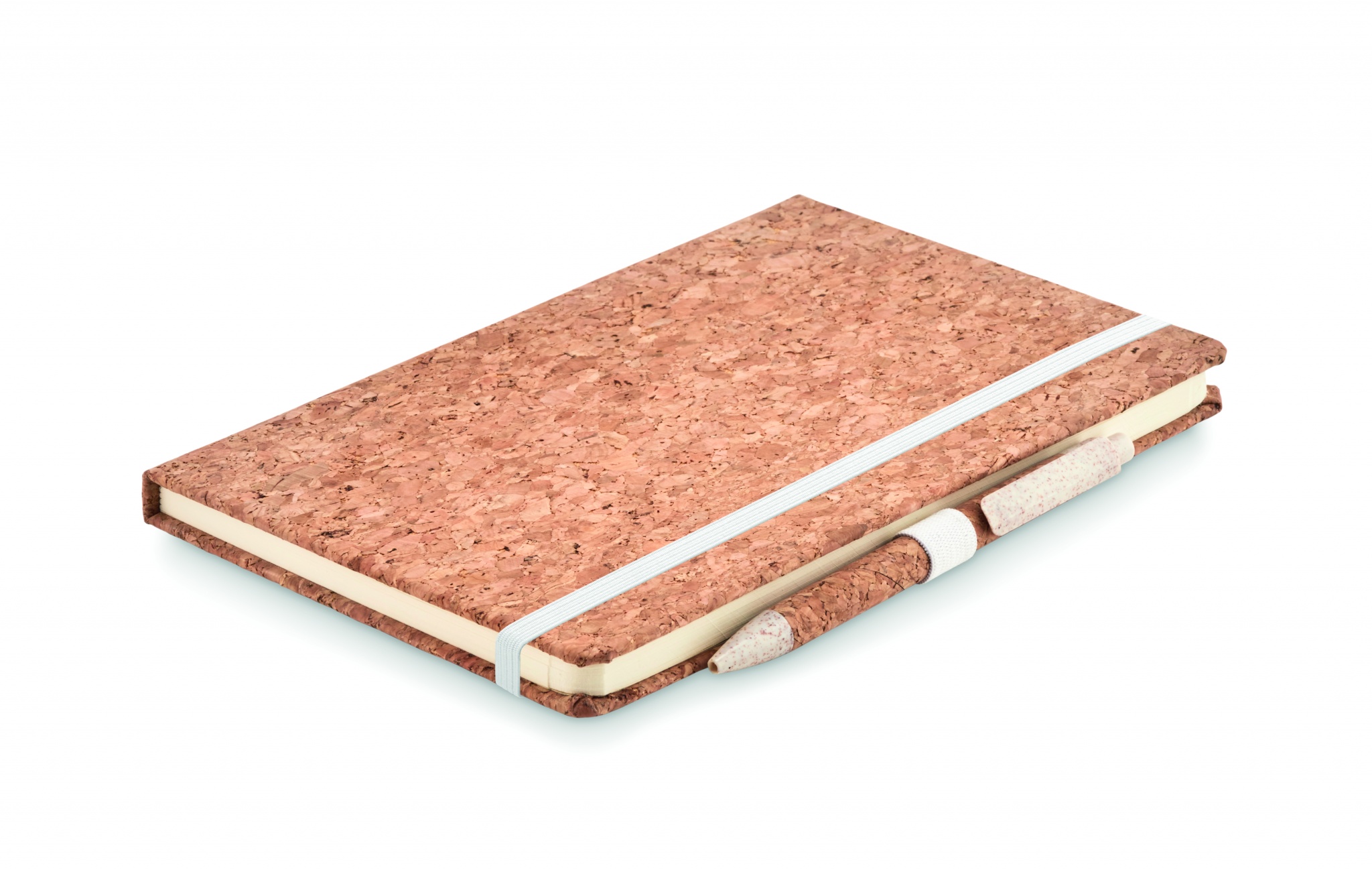 A5 cork notebook with matching pen. Hard cork cover. Casebound. 160 lined pages (80 sheets). Elastic closure strap and pen holder. Matching push button ball pen with cork barrel and 50% wheat straw and 50% PP details. Presented in a gift box. Cork is 100% natural material. Due to its structural nature and surface porosity the final print result per item may have deviations.