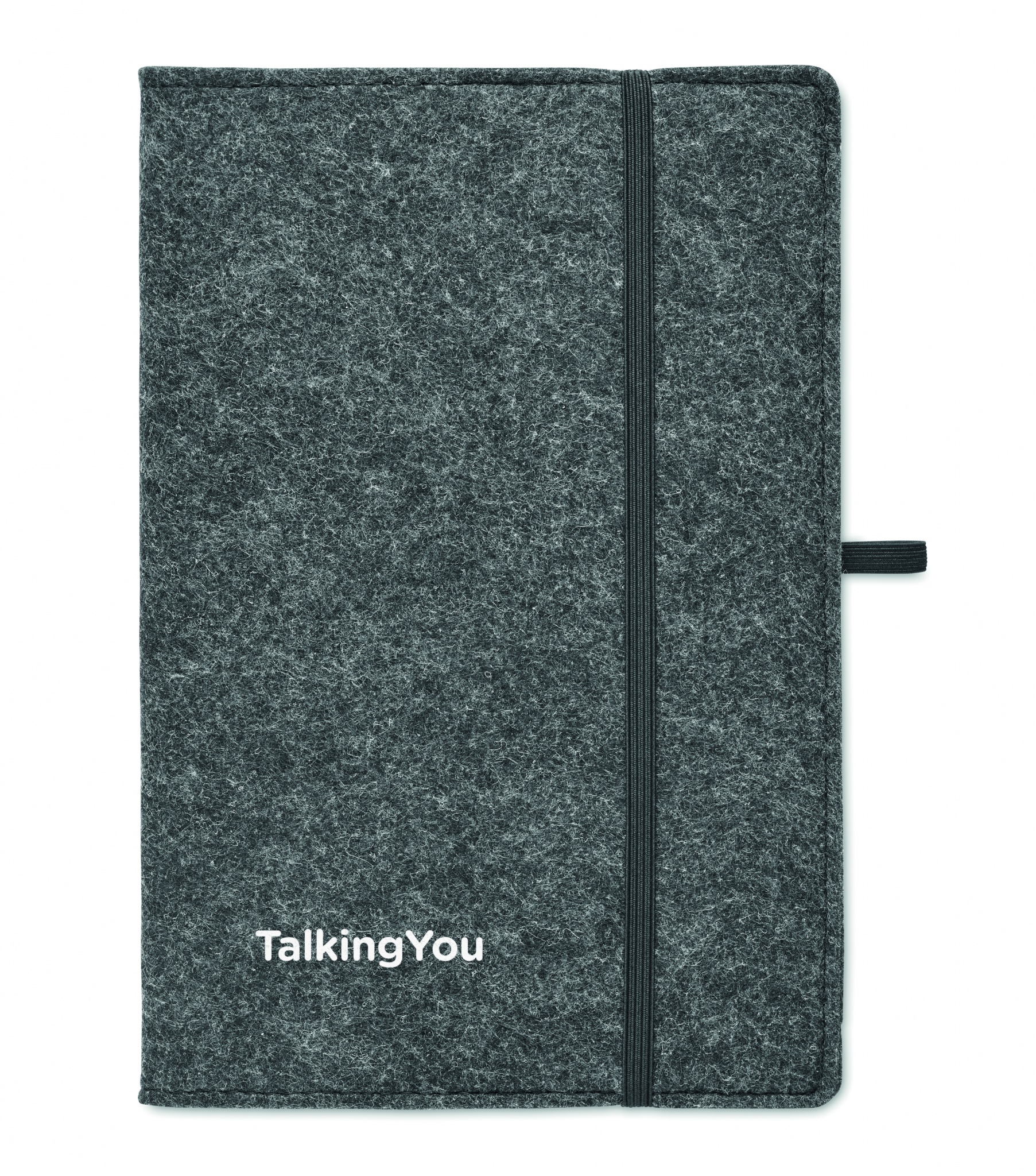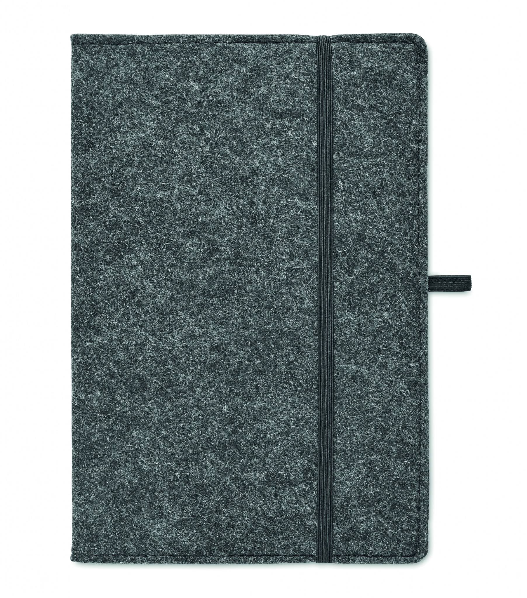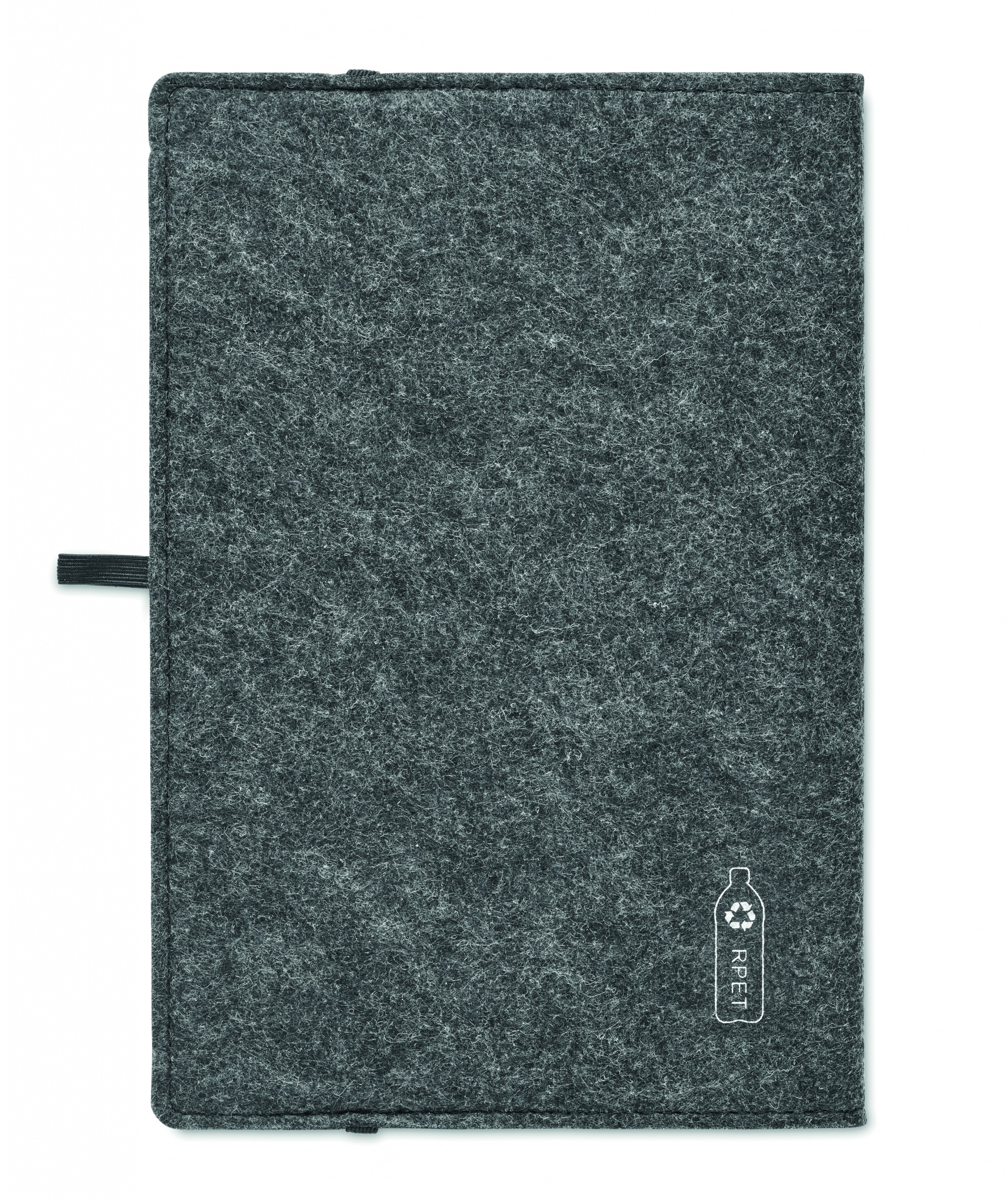 A5 notebook with RPET felt cover. 160 recycled paper lined pages (80 sheets / 70 gr/m²). Elasticated pen loop.