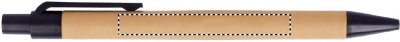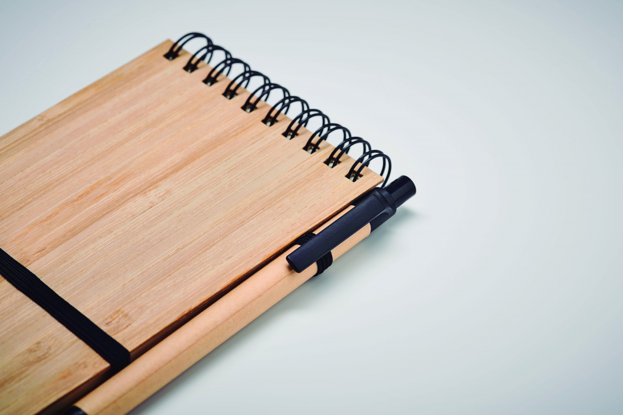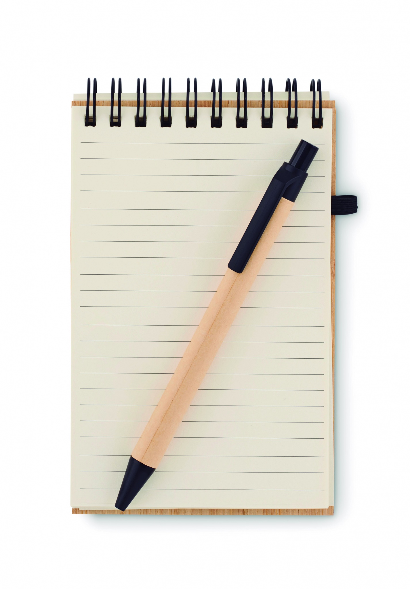A6 notepad with bamboo hard cover. Twin-wire. 140 plain recycled paper pages (70 sheets). Matching push button ball pen with recycled paper barrel and PLA detailing. Blue ink. Elastic closure strap and pen holder. Bamboo is a natural product, there may be slight variations in colour and size per item, which can affect the final decoration outcome.