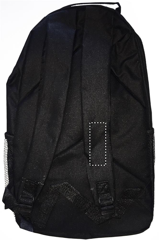 Backpack in 600D polyester with colourful contrasting facing and decorating cord on the front panel. Mesh pockets on both sides.