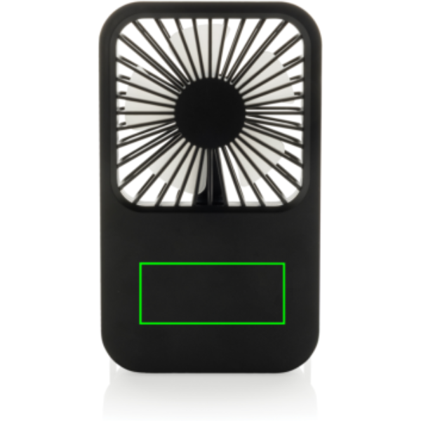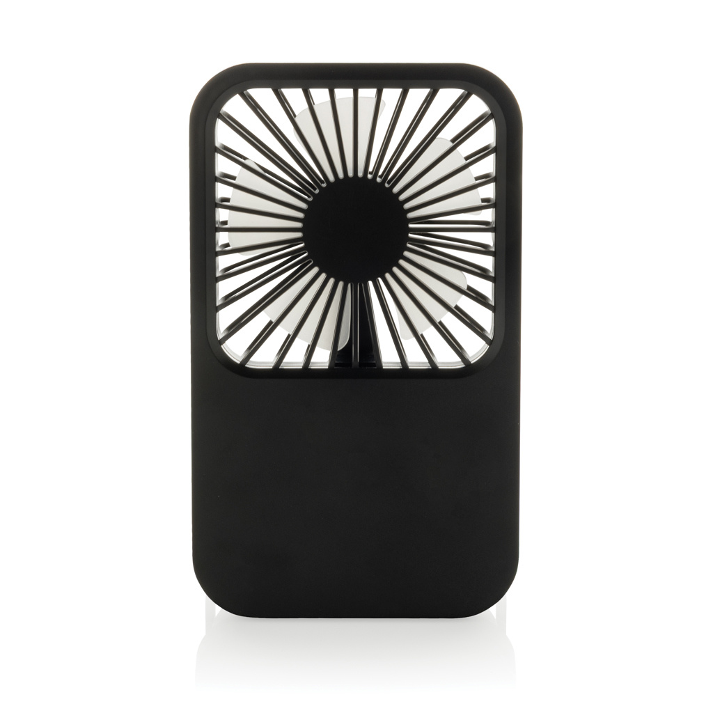 The Aervina desk fan, made from RCS certified recycled plastic, is a sleek and practical way to enjoy a refreshing breeze at home or in the office. Its modern black design combines style with function. The rechargeable 1200 mAh Li-ion battery provides up to 3 hours of working time and recharging in 4 hours via the included 120 cm black TPE USB-A to USB-C cable. With three adjustable speed levels and an adjustable stand, the Aervina fan offers flexible comfort wherever you need it. Made from RCS certified recycled ABS plastic. RCS (Recycled Claim Standard) is a standard to verify the recycled content of a product throughout the whole supply chain. Total recycled content: 58 % based on total item weight. This fan is PVC-free and packaged in an FSC® certified kraft box.Max. power: 5W | Input current: 5V / 400mA.