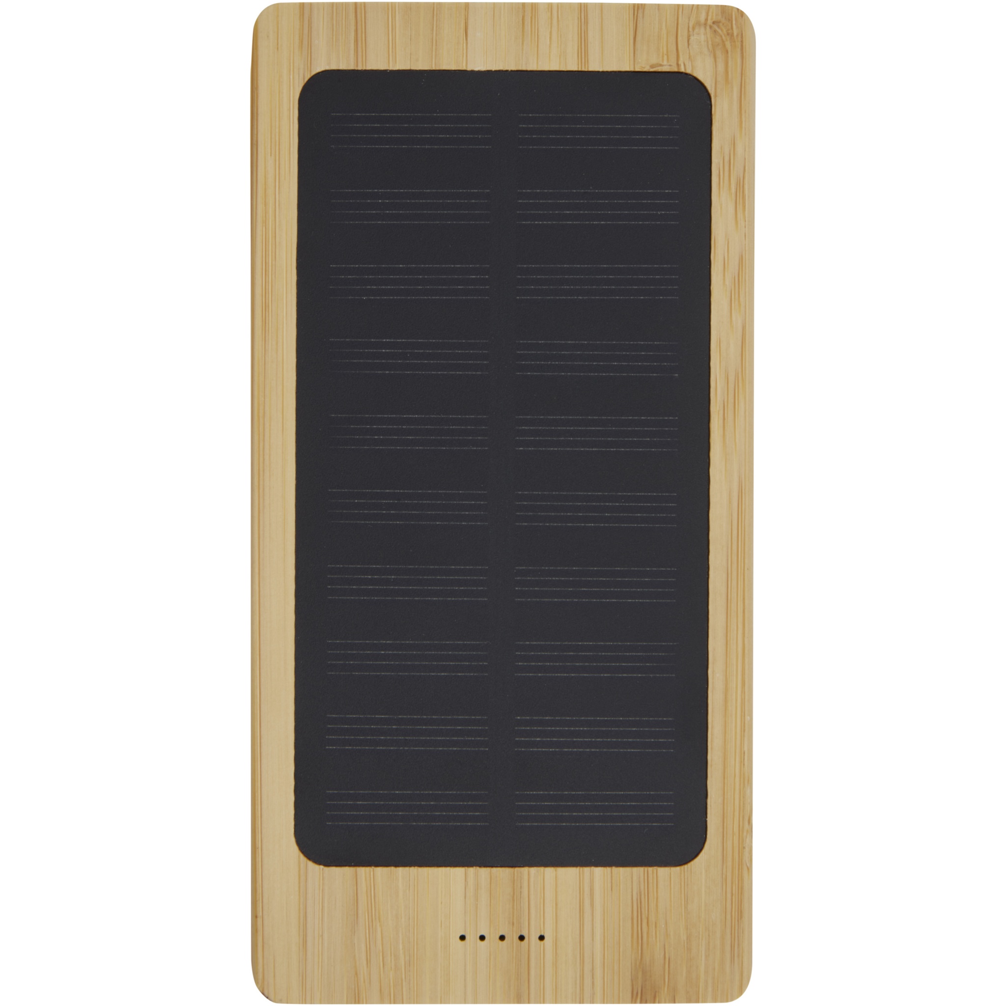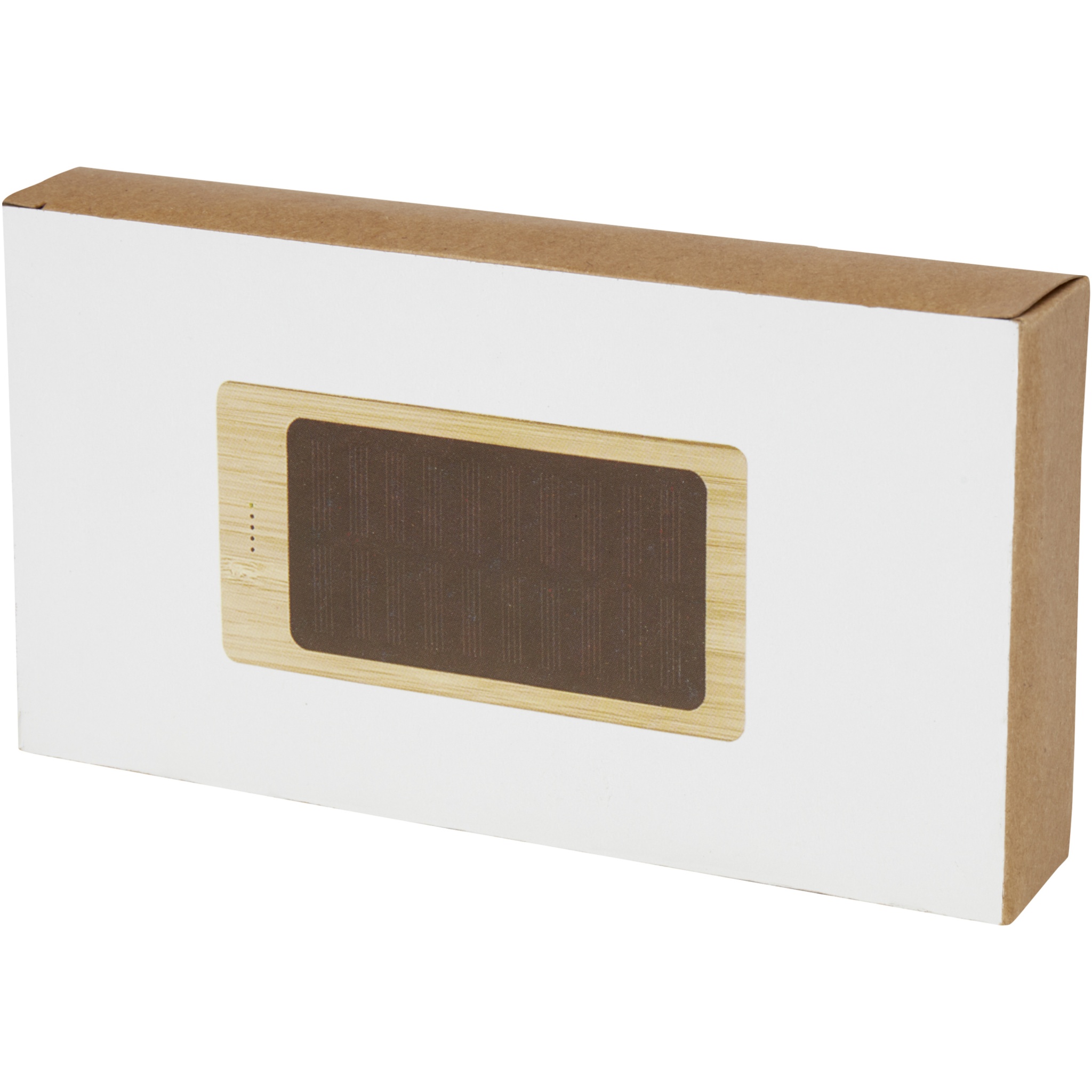 8000mAh bamboo power bank with dual USB output. Integrated solar panel for quick topup charging, ideal for outdoor activities. 5V/2A Type-C input, 5V/1A USB output 1 and 5V/2A USB output 2. No accessory cable provided for sustainability purposes. Delivered in a gift box with an instruction manual (both made of sustainable materials).