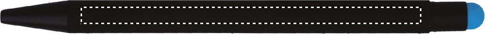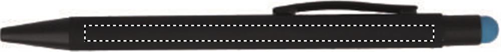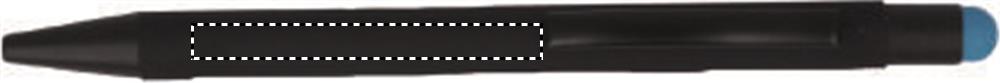 Push button stylus pen in aluminium. When the logo is engraved on to the barrel, the colour revealed matches the colour of the touch tip. Blue ink.
