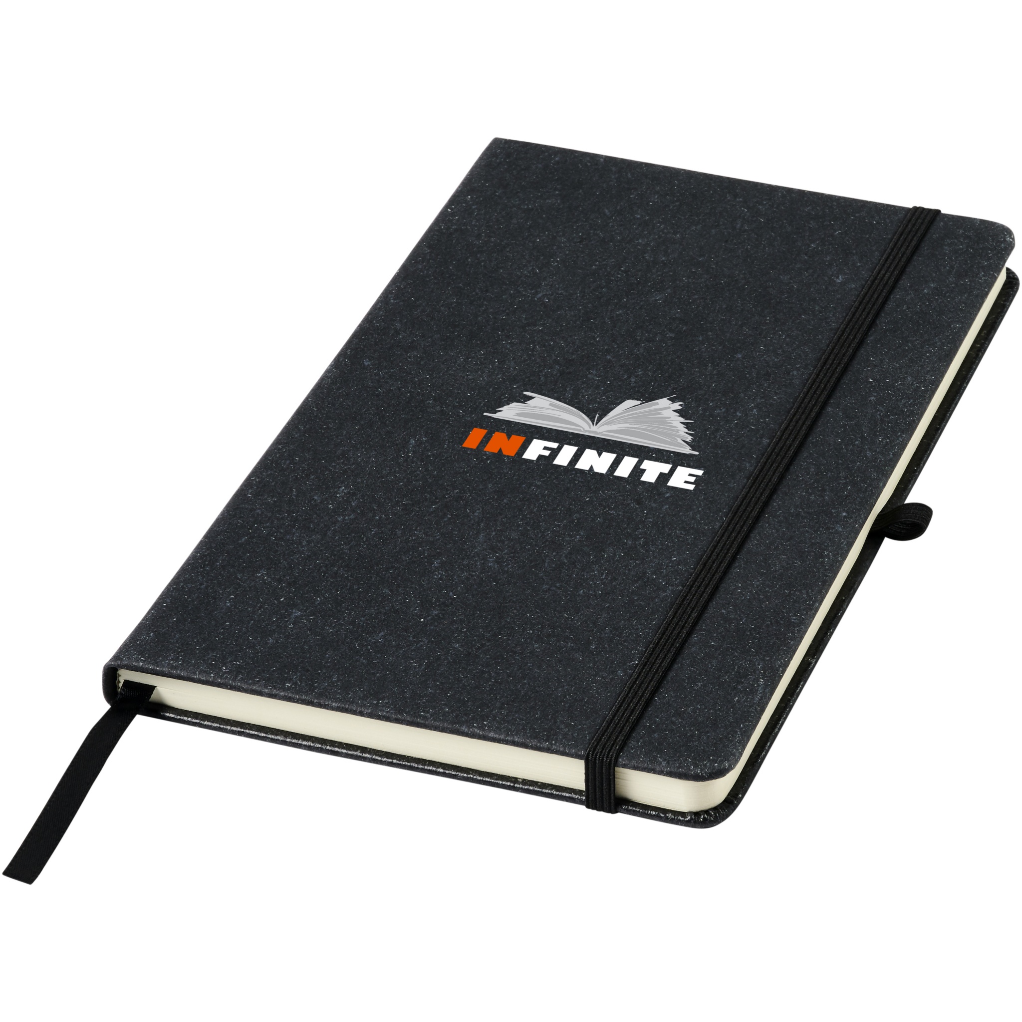 A5 size reference notebook with cover made of leather leftover pieces. Features an elastic band, pen loop, ribbon marker and 80 sheets, 80 g/m² lined paper.
