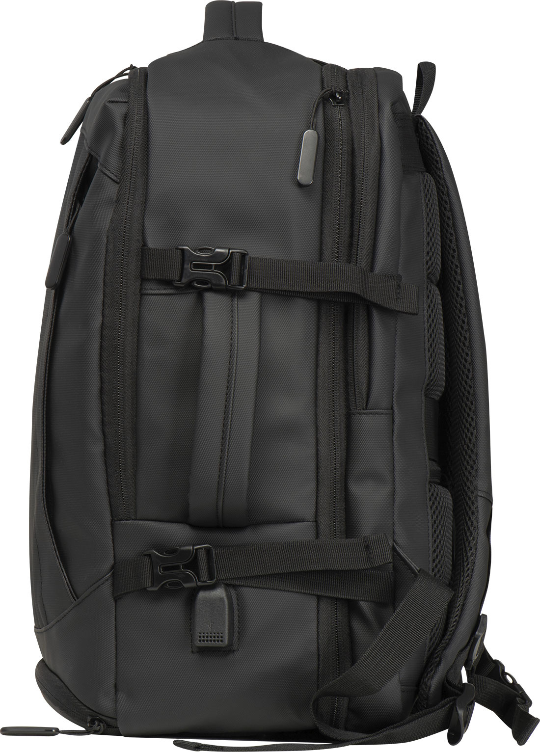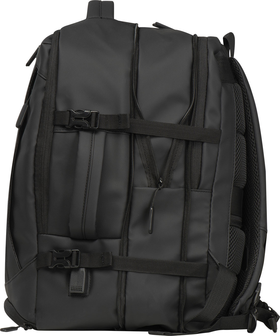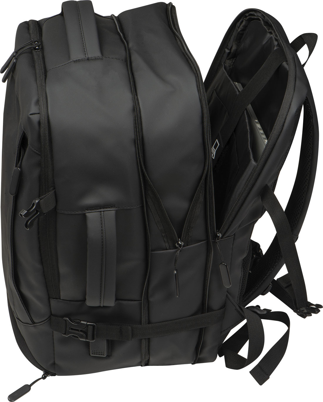 High-quality backpack made from 300D polyester. This waterproof backpack features multiple compartments: a laptop compartment with closure and additional slip pocket, a security pocket at the back, a side pocket with mesh insert and expandable zipper, a dirt compartment at the bottom, a padded slip pocket beneath the front, a front side zipper pocket, various internal slip pockets. Additionally, it includes a USB port with cable, two carrying handles, a trolley strap, padded shoulder straps, padded back, and a zipper to expand the backpack. The perfect companion not only for business trips.