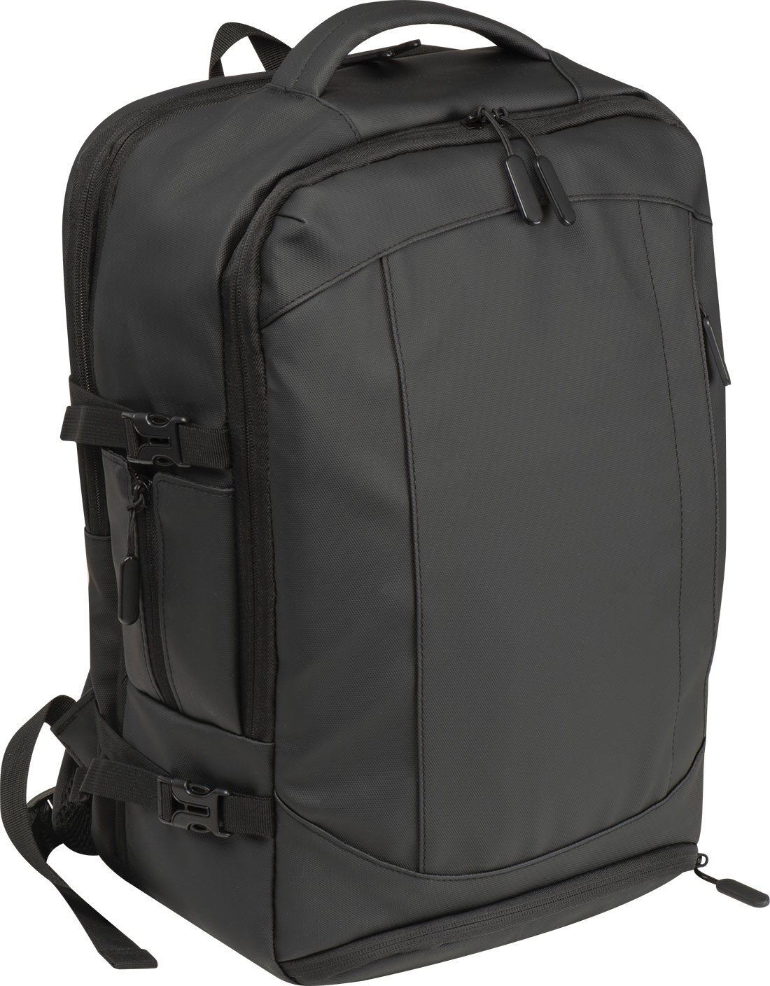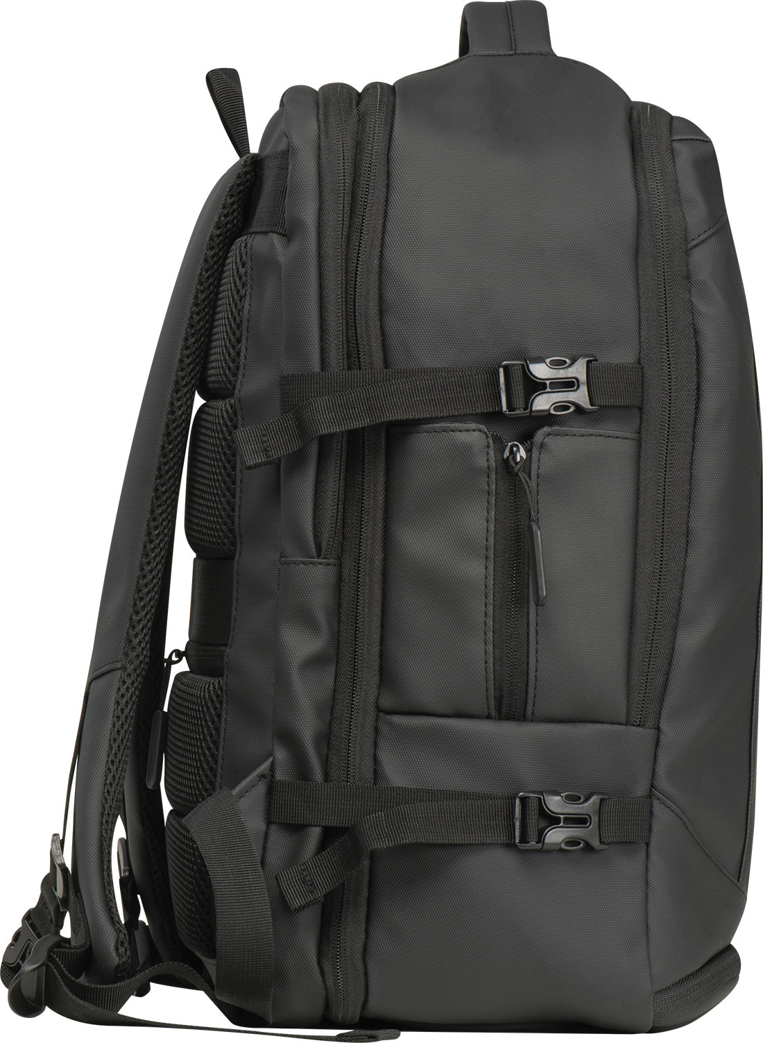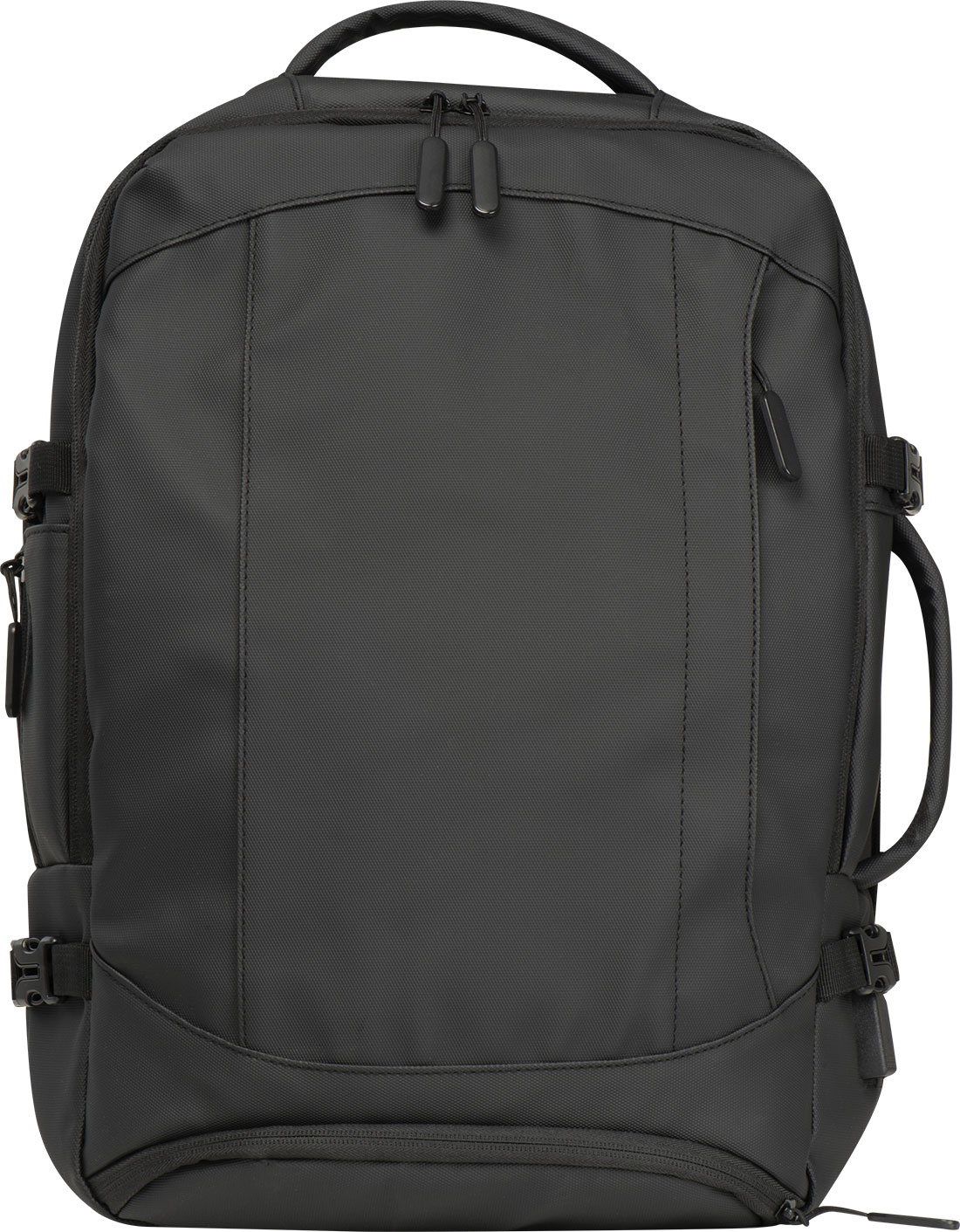 High-quality backpack made from 300D polyester. This waterproof backpack features multiple compartments: a laptop compartment with closure and additional slip pocket, a security pocket at the back, a side pocket with mesh insert and expandable zipper, a dirt compartment at the bottom, a padded slip pocket beneath the front, a front side zipper pocket, various internal slip pockets. Additionally, it includes a USB port with cable, two carrying handles, a trolley strap, padded shoulder straps, padded back, and a zipper to expand the backpack. The perfect companion not only for business trips.