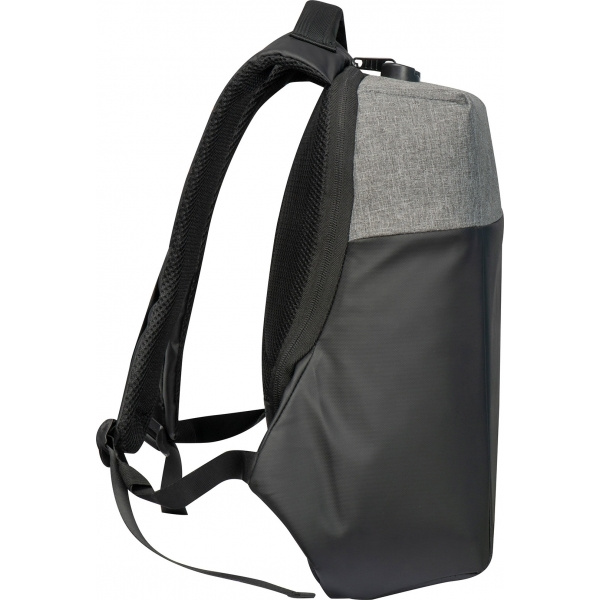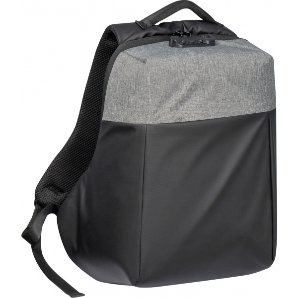 Trolley ready anti-theft hard shell backpack made of 600D polyester with extra features: Combination lock for the main compartment, anti-theft compartment on the back, small zippered compartment on the padded shoulder strap, padded back panel, padded carry handle, laptop compartment with front pocket and elastic straps, a USB port for connecting a powerbank (not included), four pen loops, opening for headphones, three slip pockets and a removable key ring. With two velcro closures inside, the backpack can be opened either partially or fully. Your logo will be placed on the front.