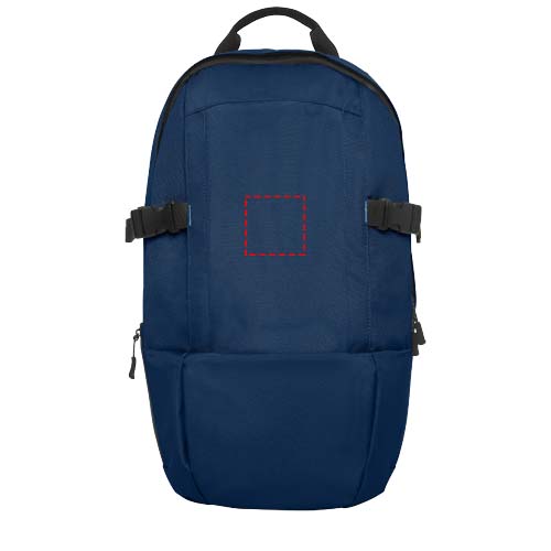Sustainable GRS certified RPET laptop backpack made with 50% recycled materials. Features a large zippered main compartment with a padded 15" laptop sleeve with velcro closure, a hanging hook, and a front vertical zippered compartment. Comes with additional straps with buckle closure for safety, comfortable padded shoulder straps, grab handle, mesh back with a zippered pocket and expandable mesh side pocket.