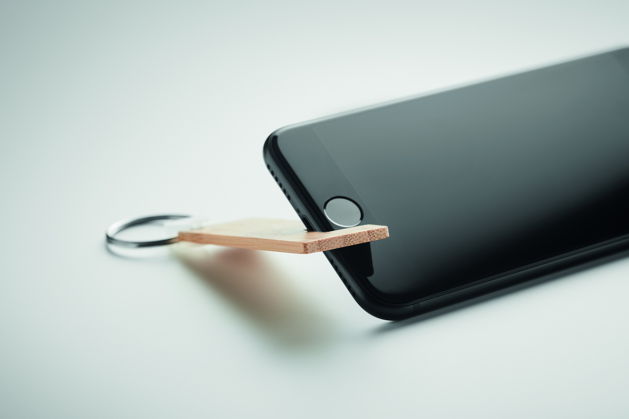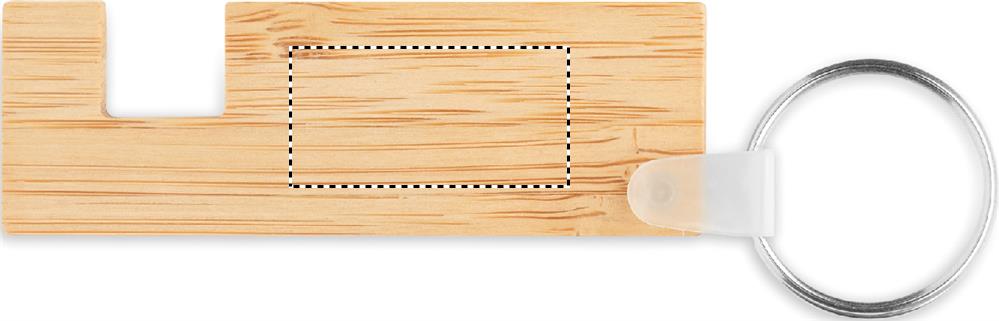 Bamboo key ring with phone stand functionality. Bamboo is a natural product, there may be slight variations in colour and size per item, which can affect the final decoration outcome.