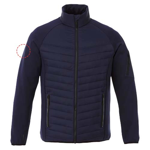 The Banff men's hybrid insulated jacket – a perfect fusion of style and performance. The inner stormflap ensures that the wind does not come through the jacket, and the dropped back hem adds an extra touch of coverage for added warmth. The elasticated binding in a contrasting colour adds a stylish accent while ensuring a secure fit. The jacket's dull cire 380T woven fabric has a water repellent and downproof finish, made of nylon (38 g/m2). The contrast fabric is an interlock knit made of polyester and elastane (245 g/m2), adding flexibility and comfort. The fake down insulation of polyester provides lightweight warmth, perfect for chilly days.