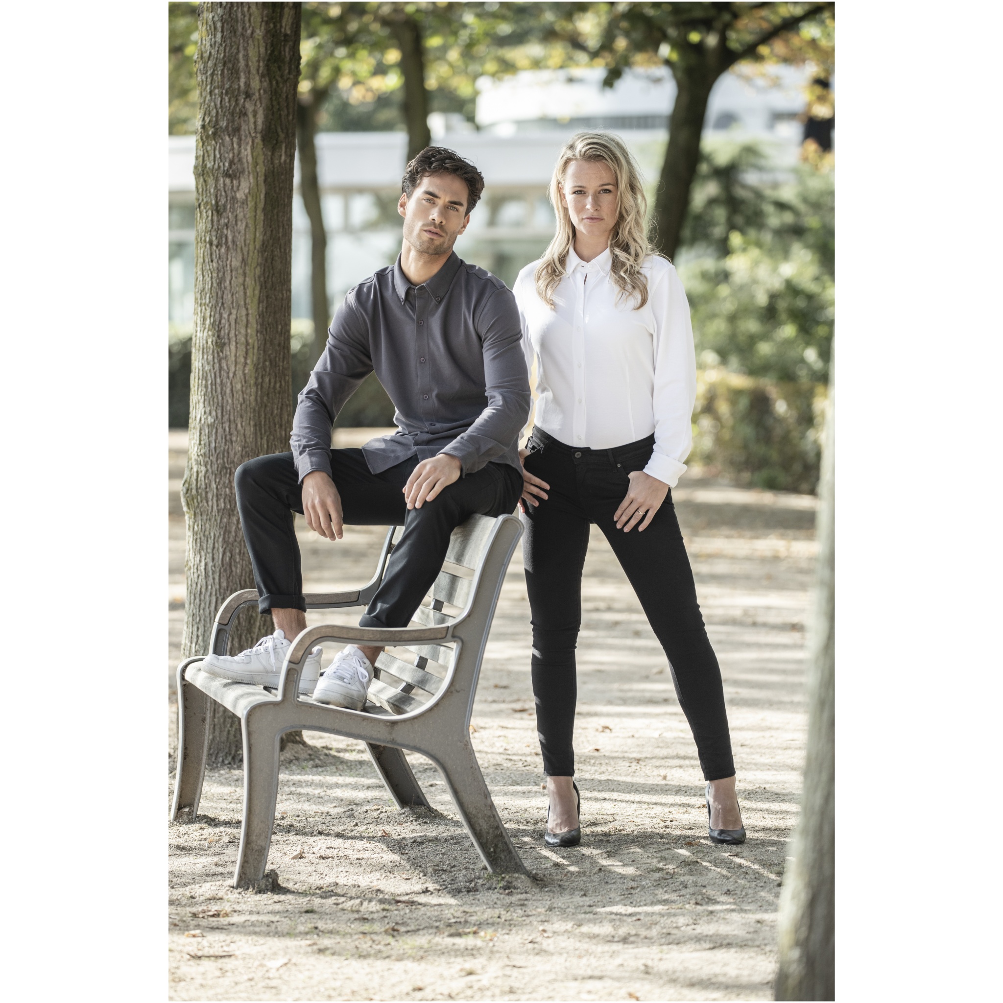 Self fabric collar. Stretch fabric. Adjustable cuff with single pleat. Button-down collar. Shaped seams and tapered waist for flattering fit. Satin piping at inside neck. Dyed-to-match engraved buttons. Woven main label.