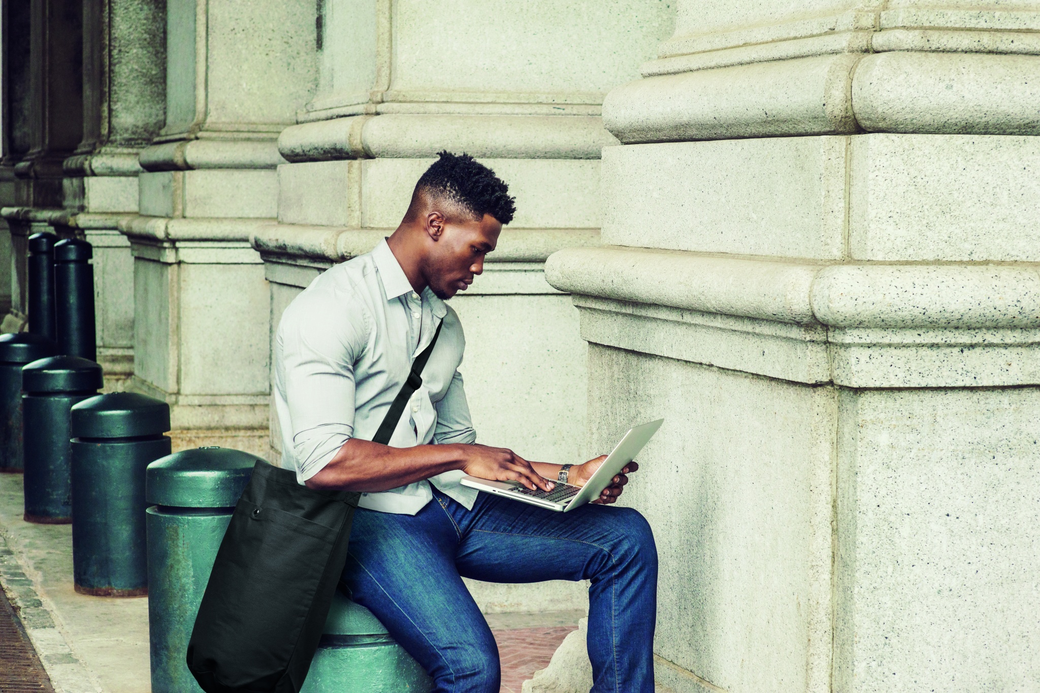 Canvas bag with long adjustable cross shoulder strap and large front pocket with snap closure. Includes inner pocket. 270 gr/m².