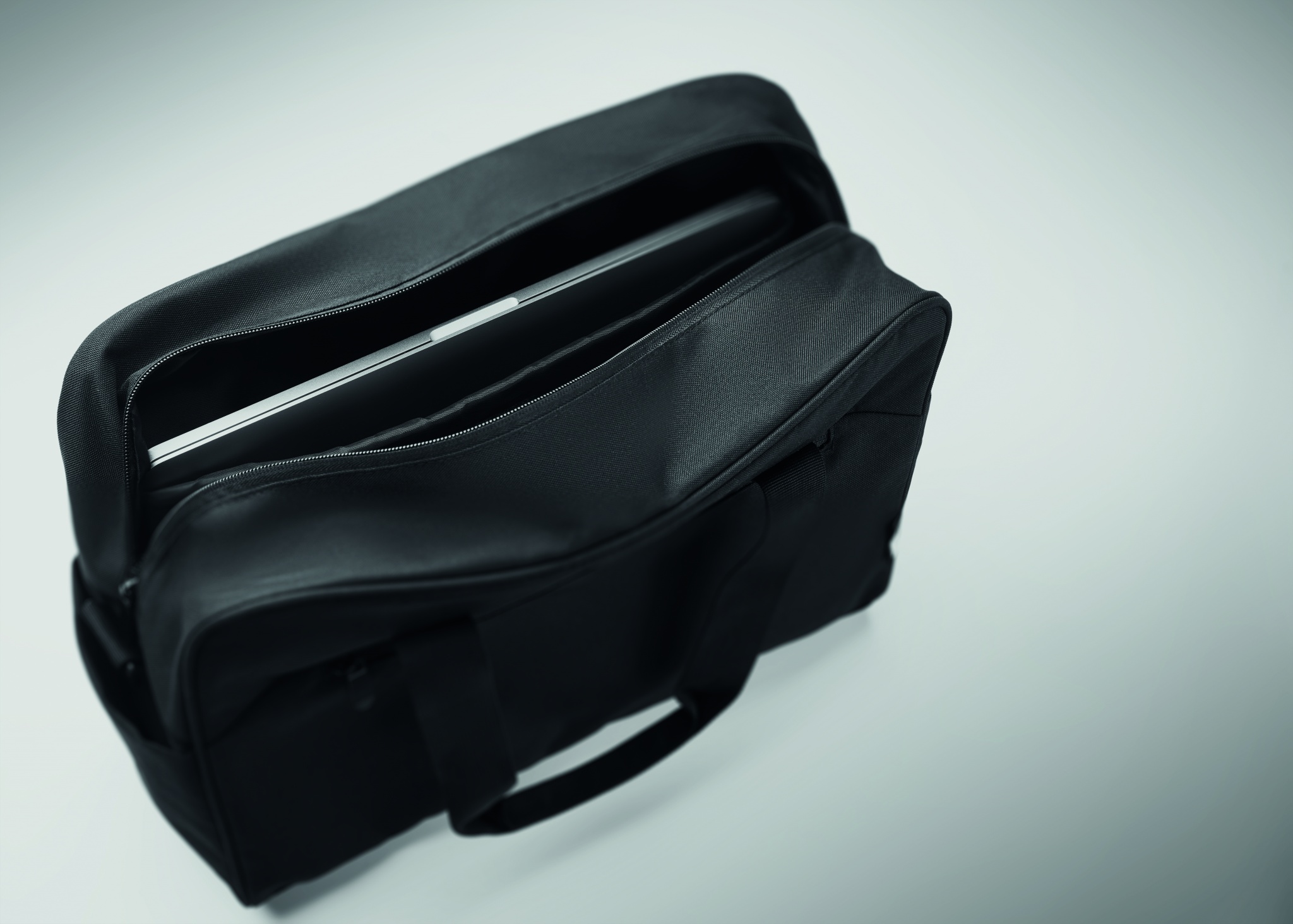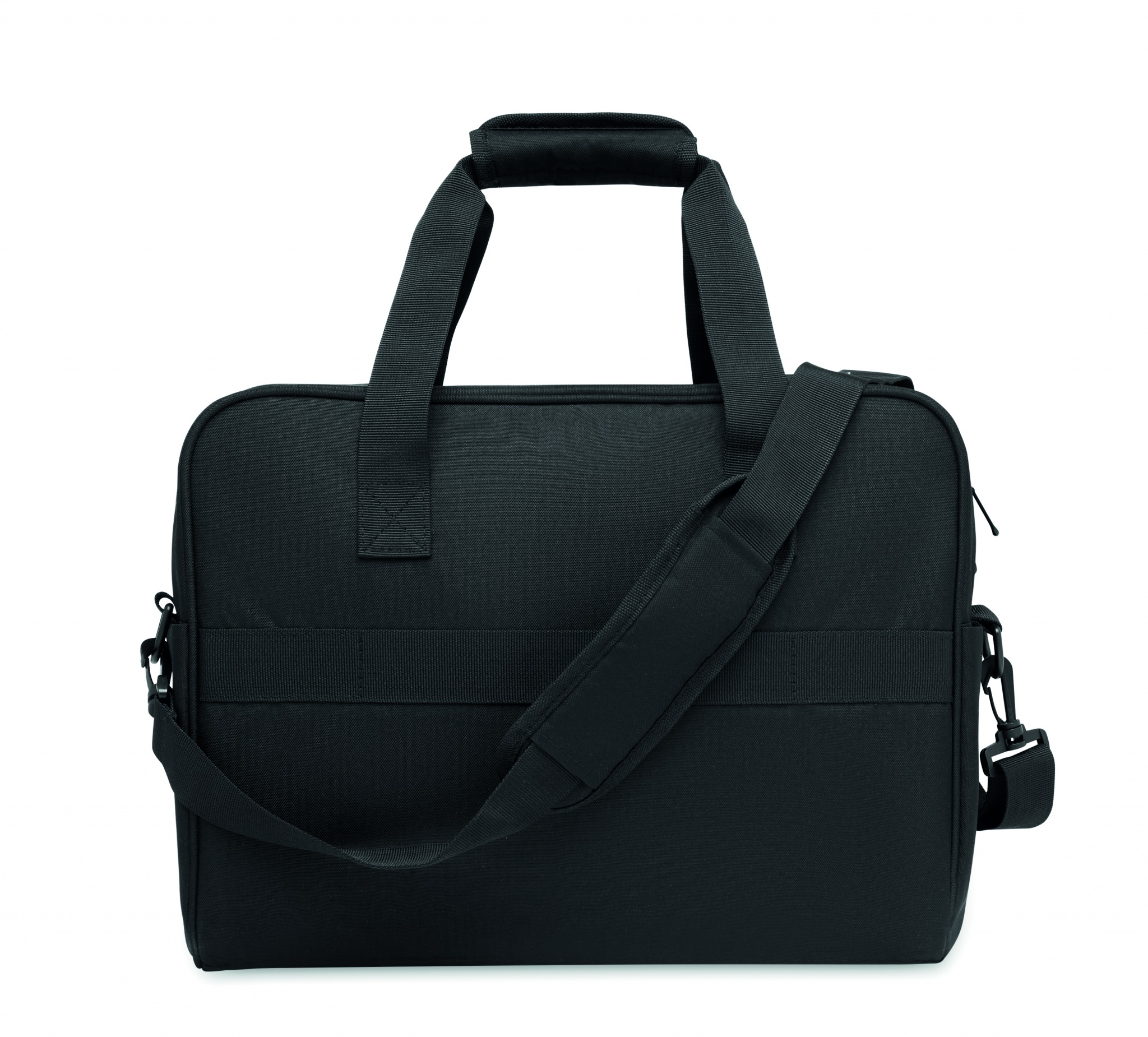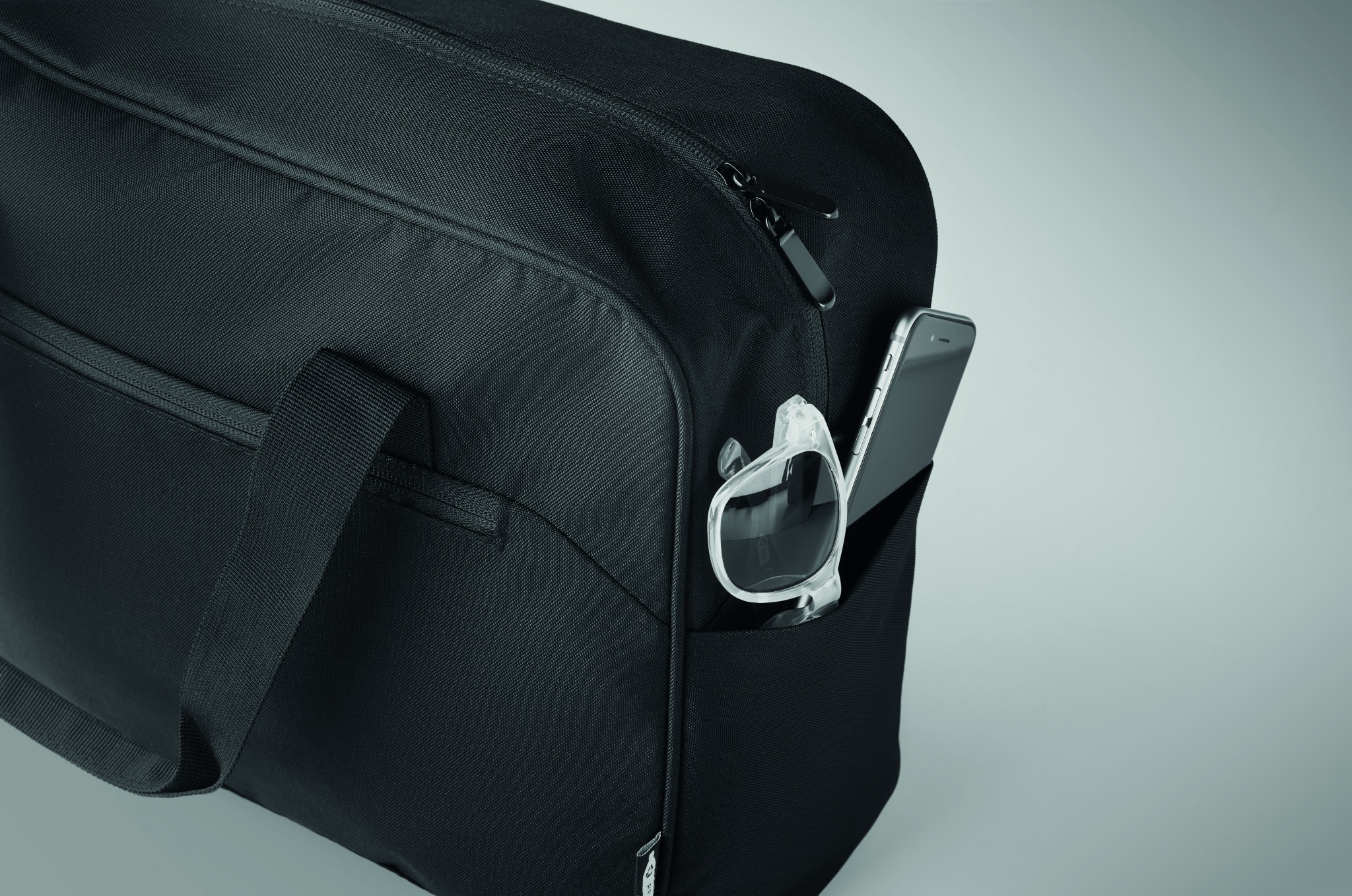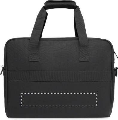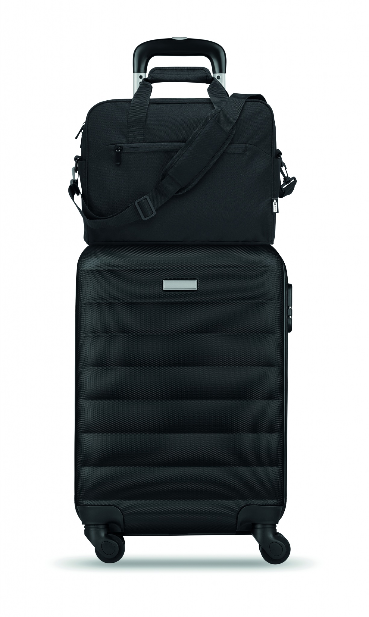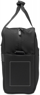 Carry-on hand luggage travel bag in 600D RPET with large zippered front pocket, two small side pockets. Includes 15 inch laptop compartment. Padded removable and adjustable shoulder strap. Trolley holder on reverse side.