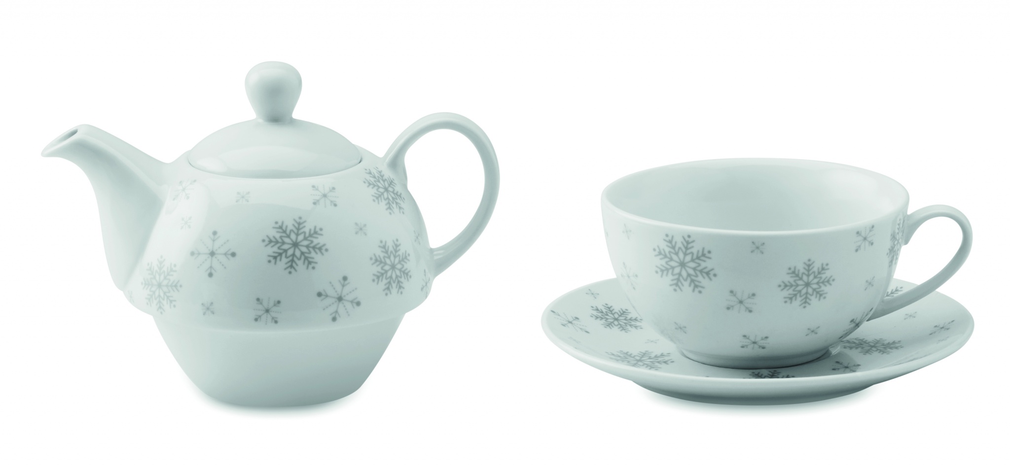 Tea set including a 400 ml teapot with a snowflake design and 260 ml ceramic cup. Presented in a carton gift box.Ceramic transfer is dishwasher safe, pad printing is not dishwasher safe.