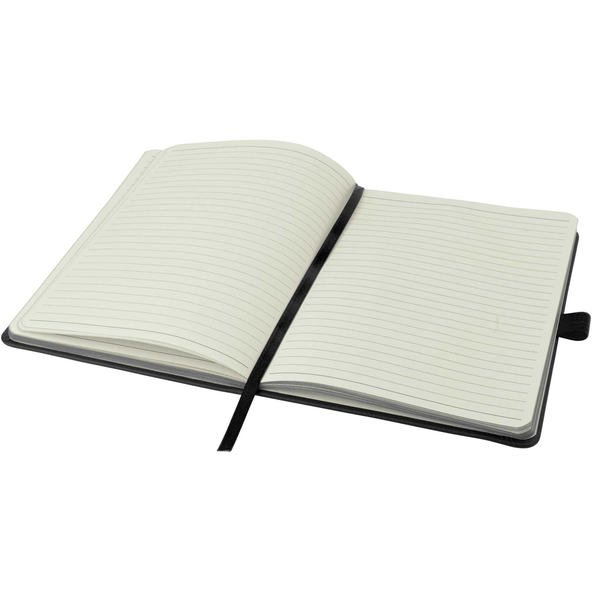 A5 bound notebook of 80 sheets of beige lined paper (70 gm2) with ribbon and elastic closure.