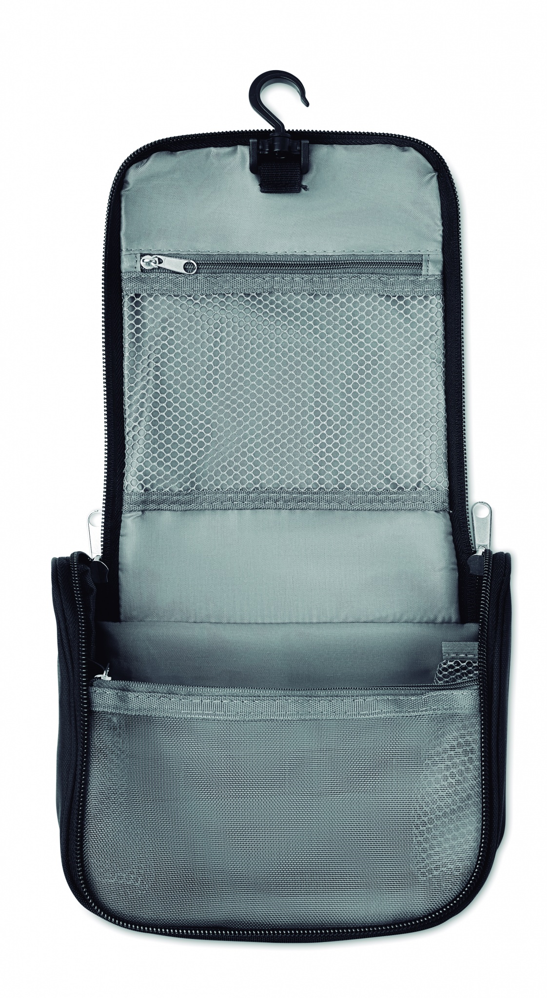 Hanging cosmetic bag with multi-compartments and mesh pockets in high density polyester. Ideal when travelling.