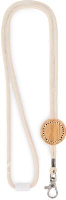 Cotton cord lanyard with round bamboo detail, metal hook and safety breakaway. Length: 50 cm. Bamboo is a natural product, there may be slight variations in colour and size per item, which can affect the final decoration outcome.