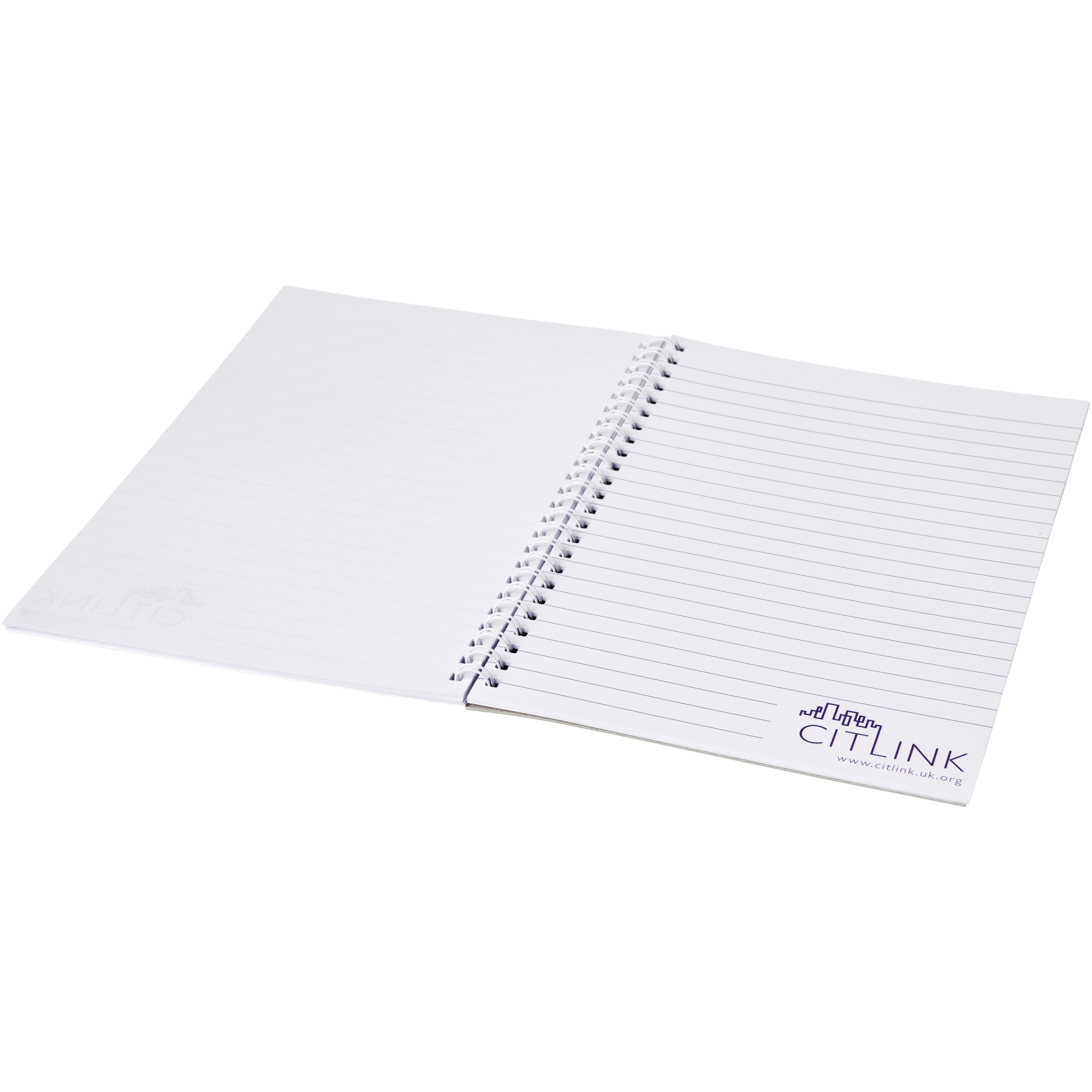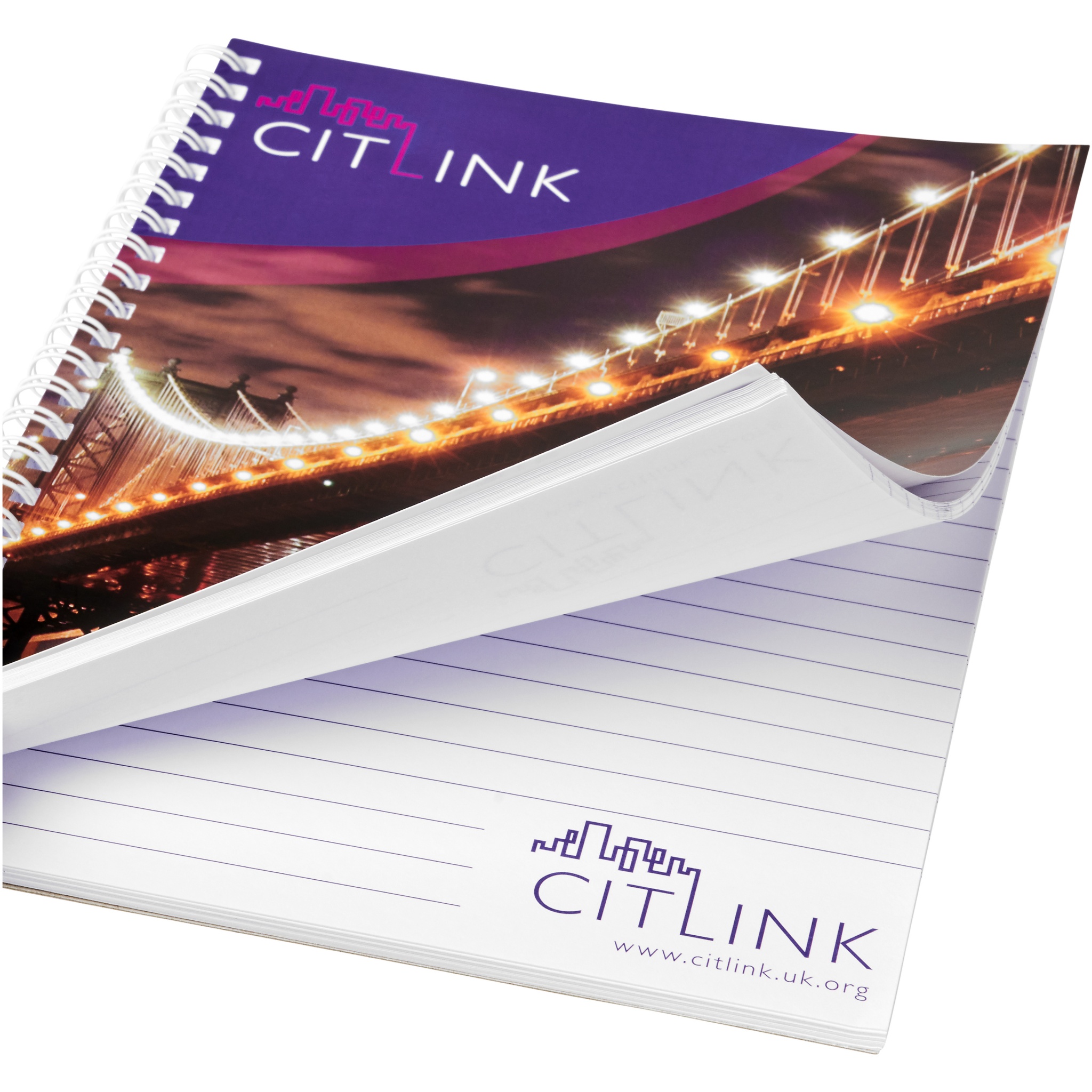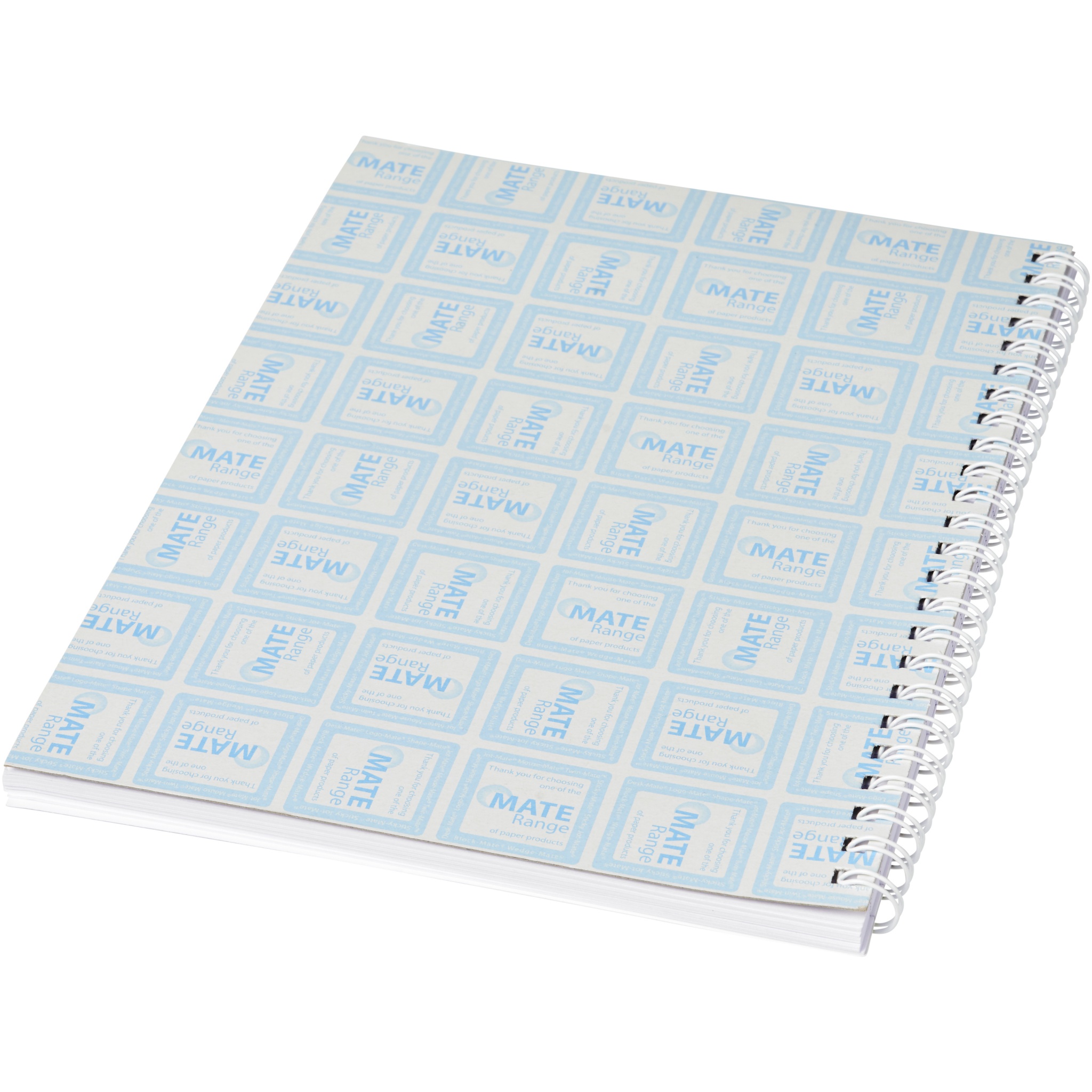 Desk-Mate® spiral A4 notebook. This notebook includes a white or black wire, a glossy card front cover (250 g/m2) and blank paper (80 g/m2). Standard delivered with 50 sheets, also available with 80 sheets. You can customise the pages of this versatile notebook with any design - so whether you want lined paper, squares or dots - anything is possible!