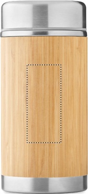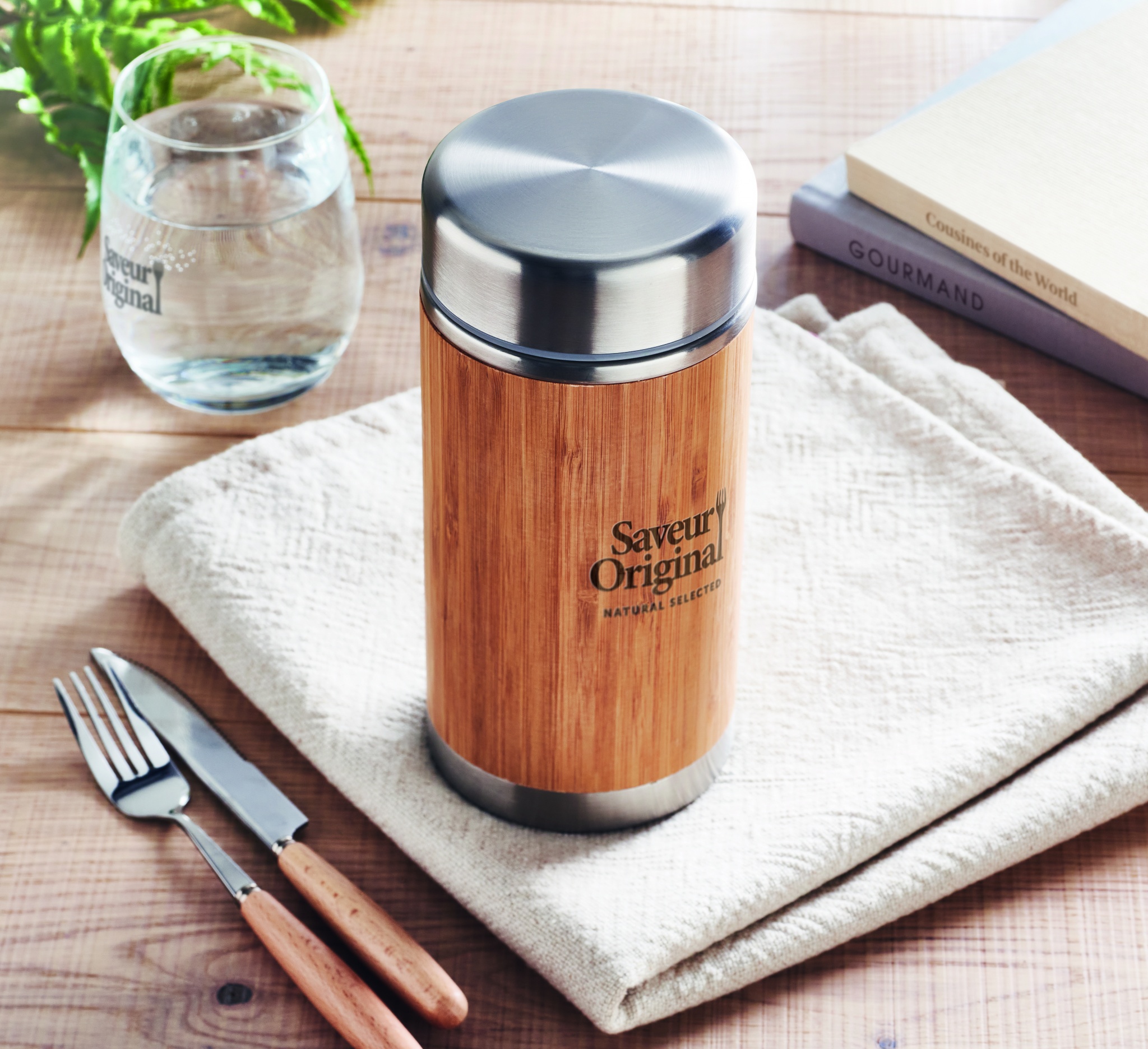 Double wall stainless steel insulated food jar with a screw top in bamboo finish. Capacity: 600 ml. Bamboo is a natural product, there may be slight variations in colour and size per item, which can affect the final decoration outcome.