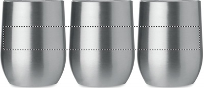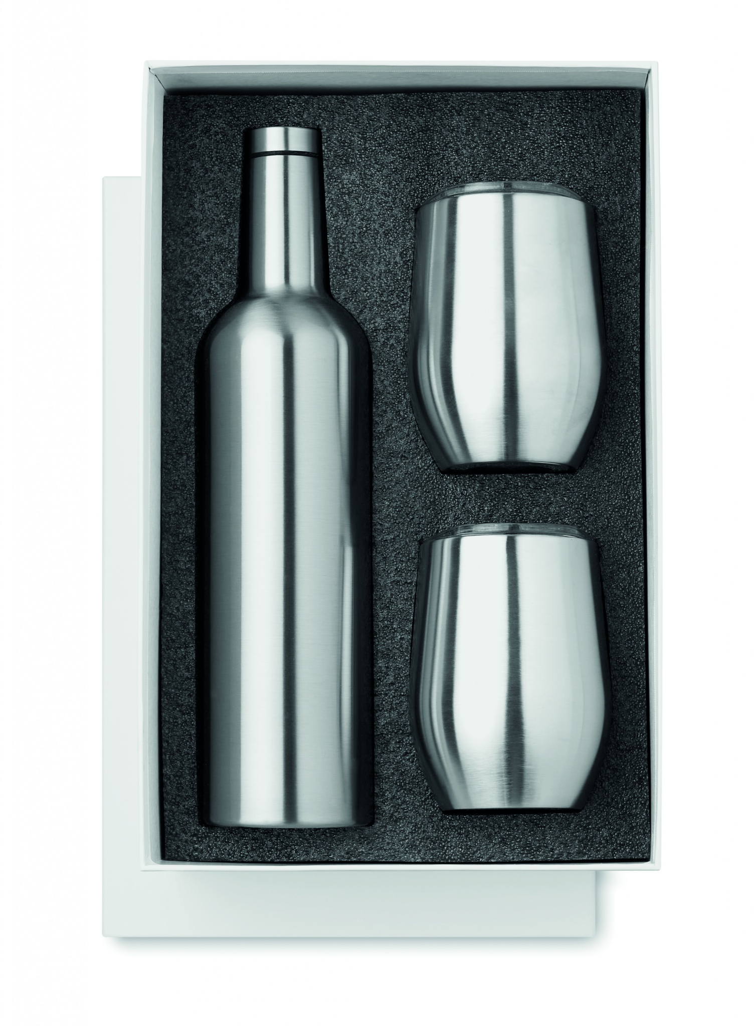 Set of stainless steel double walled bottle (750ml capacity) with 2 stainless steel double walled mugs (350ml capacity). Leak free.