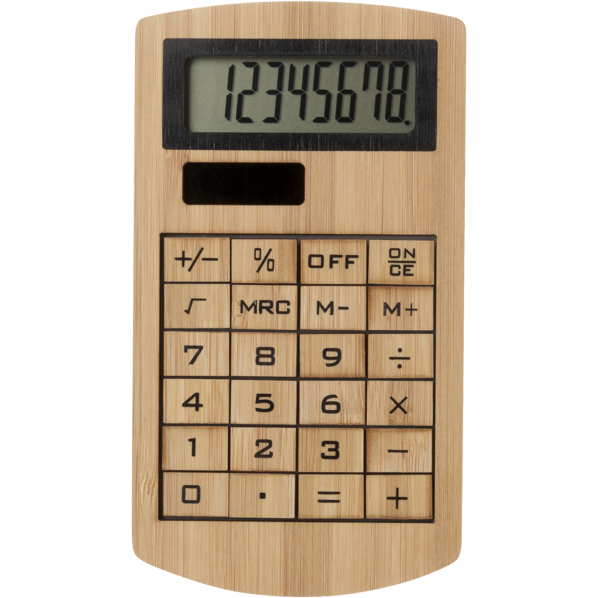 8 digit eco-friendly bamboo calculator. Works on solar power.