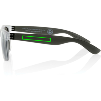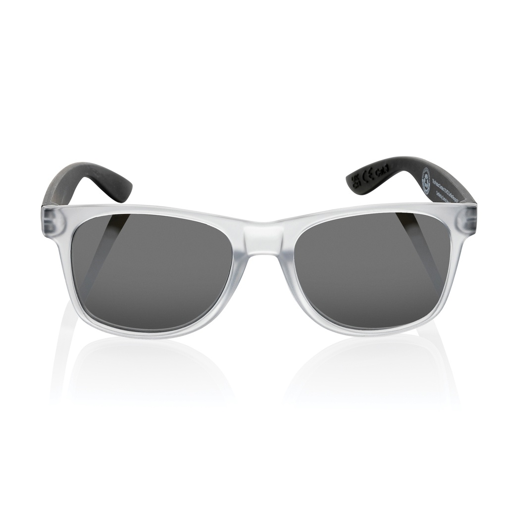 Sunglasses made with RCS certified recycled transparent PC frame. With colored mirrored lenses. Total recycled content: 72% based on total item weight. RCS certification ensures a completely certified supply chain of the recycled materials. The lenses are conform EN ISO 12312-1,UV 400 and CAT 3. Packed in a FSC® kraft box.