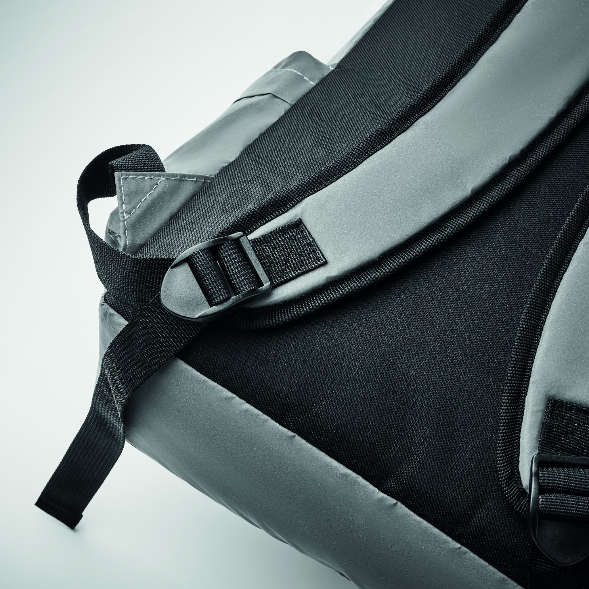 Backpack in high reflective 190T polyester and straps. It has 15 inch padded laptop compartment. Front zippered pocket, one side mesh pocket and other side zippered pocket. For comfort a padded back section in 600D recycled polyester.