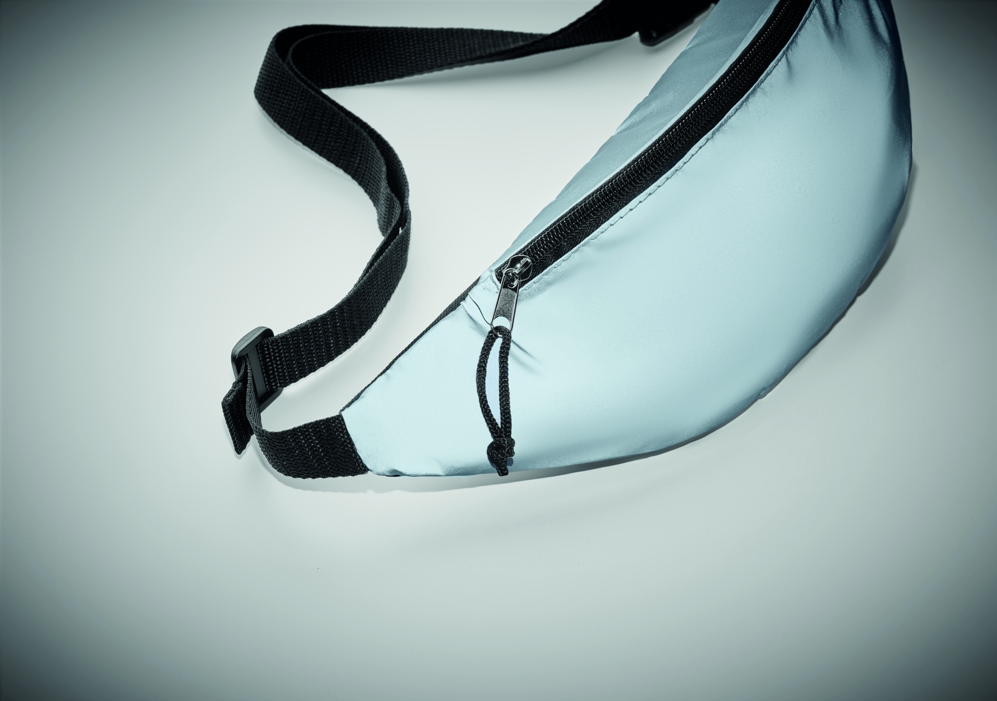 Waist bag with the front in high reflective polyester, with adjustable polyester strap.