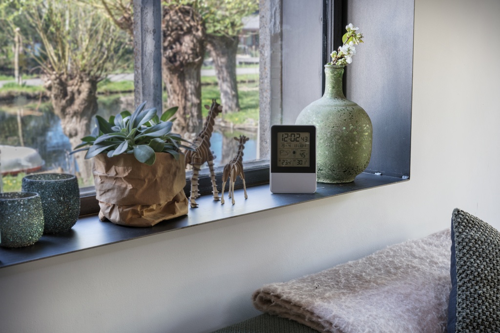 In/outdoor weather station with LCD screen and special outdoor sensor. Functions: Time and calendar, indoor/outdoor temperature, weather forecast, humidity and alarm.