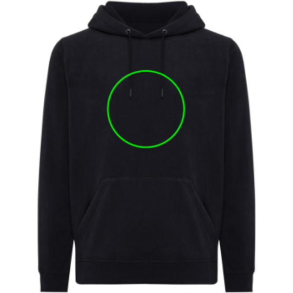 Unisex medium fit microfleece hoodie made from 100% post-consumer recycled polyester in 240 G/M². This fleece hoodie envelops you in softness and warmness. It has a convenient kangaroo pocket, double-layered hood with a tonal drawstring and metal eyelets. The Inside half-moon in woven fabric offers a perfect personalized inside neck print. Bottom hem and sleeve cuffs are made from self-fabric for extra softness. The use of genuine recycled & organic fabric materials and environmental impact claims are guaranteed, by using the AWARE™ disruptive physical tracer and blockchain technology. By scanning the QR code, you will gain access to a dedicated digital passport of the product. 2% of proceeds of each sold product will be donated to Water.org. This product is OEKO-TEX® STANDARD 100 certified.