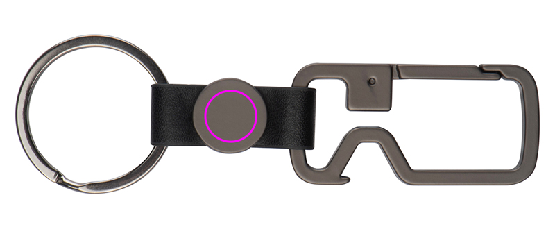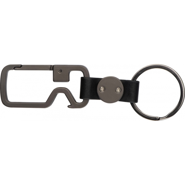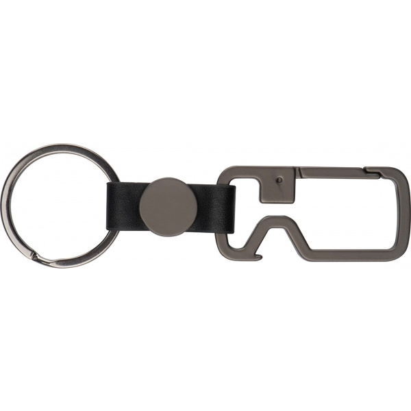 Graphite-coloured keyring with carabiner, key ring and bottle opener. Your logo will be engraved on the round piece.