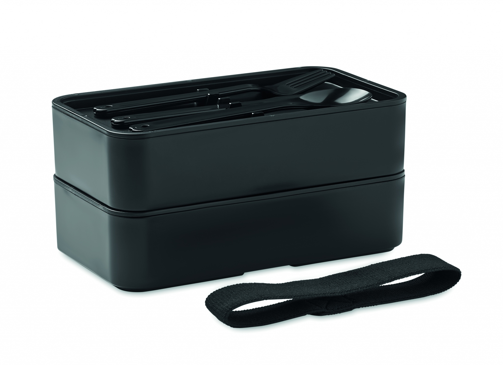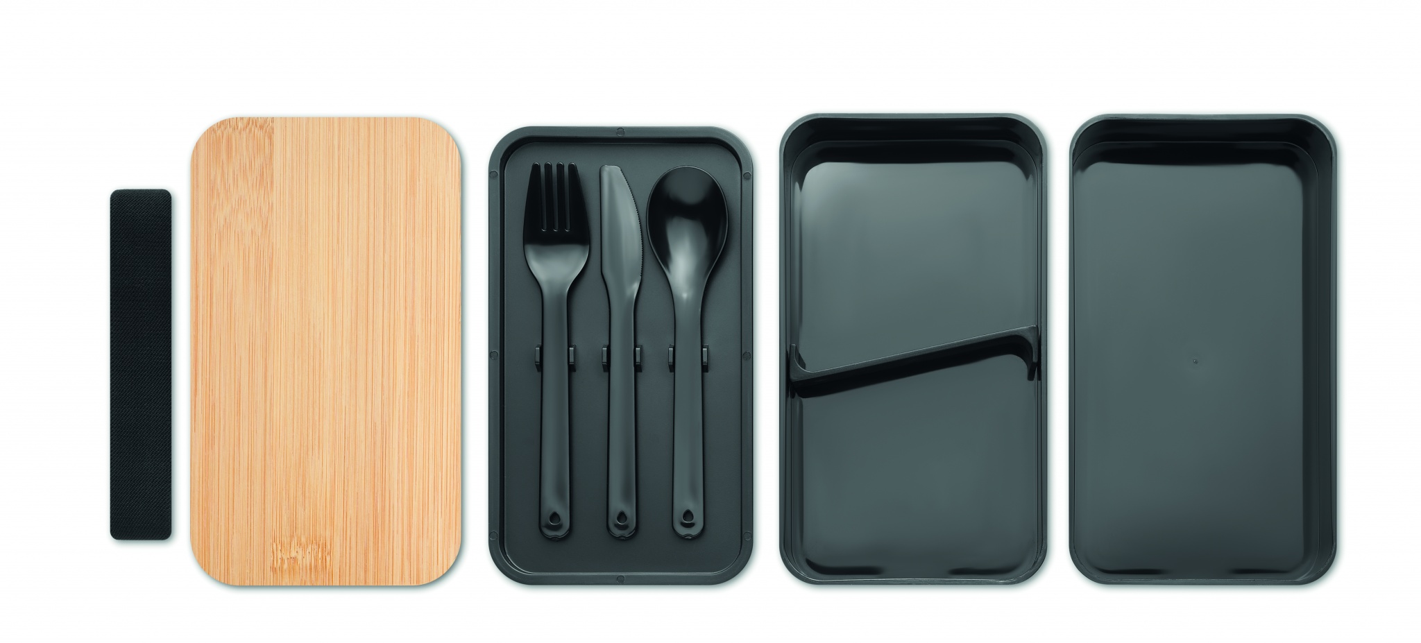 PP two-tier lunch box with bamboo lid including 1 removable PP divider and 3 cutlery utensils with attachable polyester band. Capacity 400ml (2x). Bamboo is a natural product, there may be slight variations in colour and size per item, which can affect the final decoration outcome.
