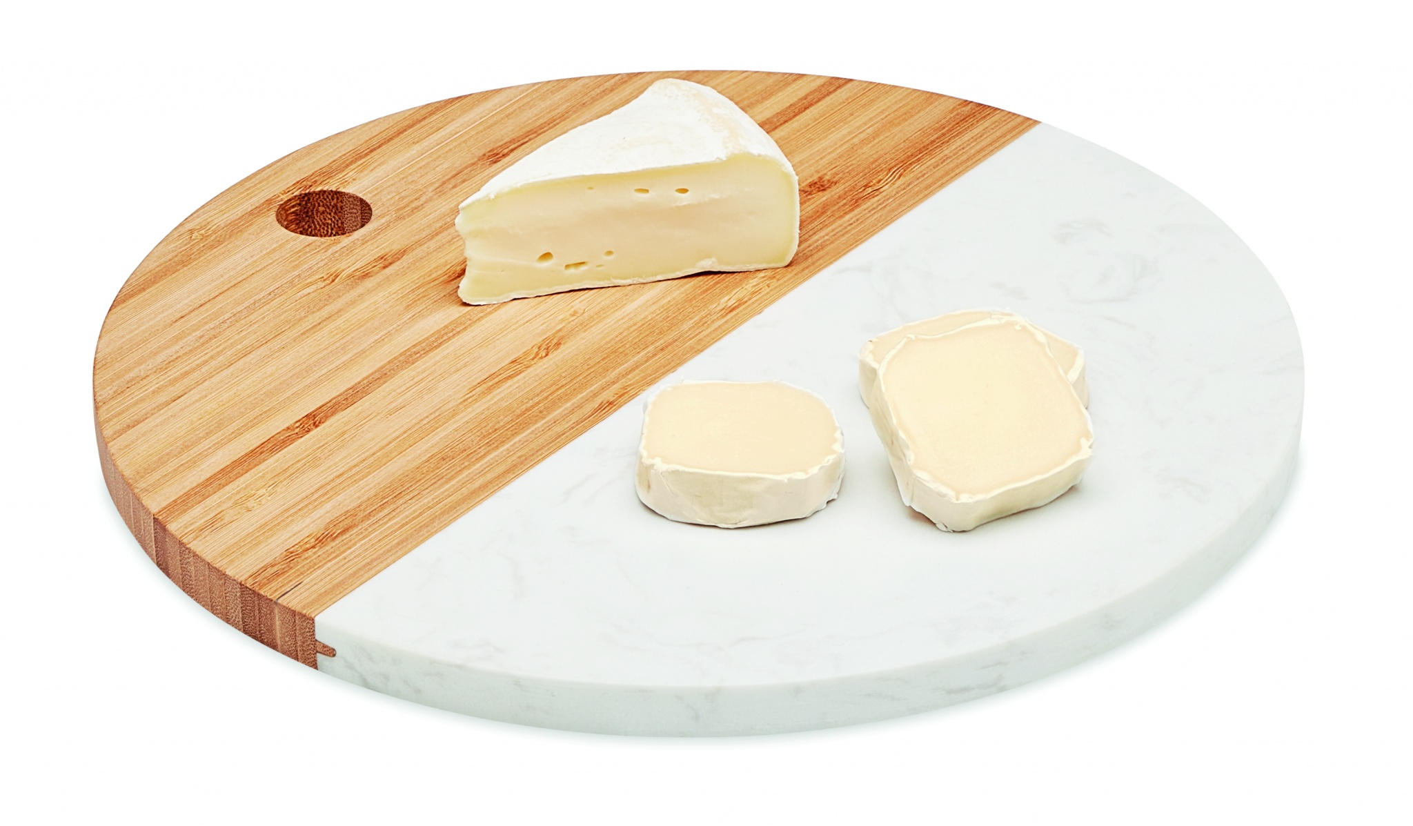 Serving board in marble and bamboo. Circular shape. Bamboo is a natural product, there may be slight variations in colour and size per item, which can affect the final decoration outcome.