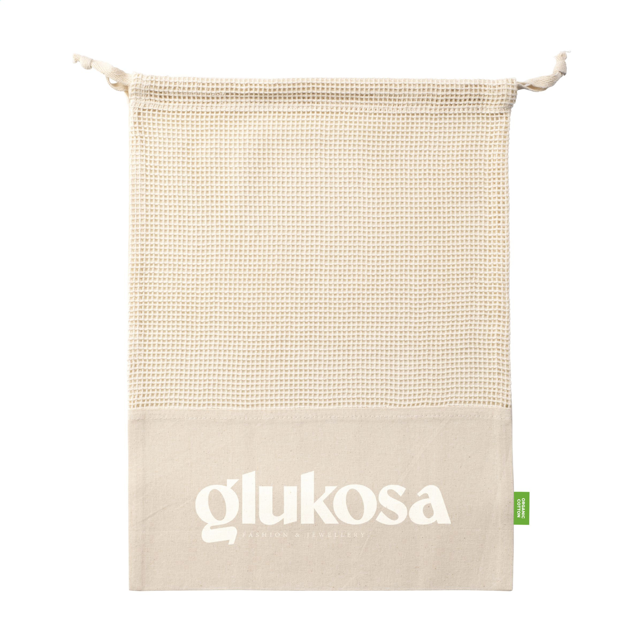 WoW! Reusable fruit and vegetable bag made from 100% organic cotton (120 g/m²). Mesh cotton on the front and plain cotton on the back with a handy drawstring closure. Using this bag helps to reduce the number of one-use plastic bags in circulation. GOTS-certified. Capacity approx. 1.5 litres
