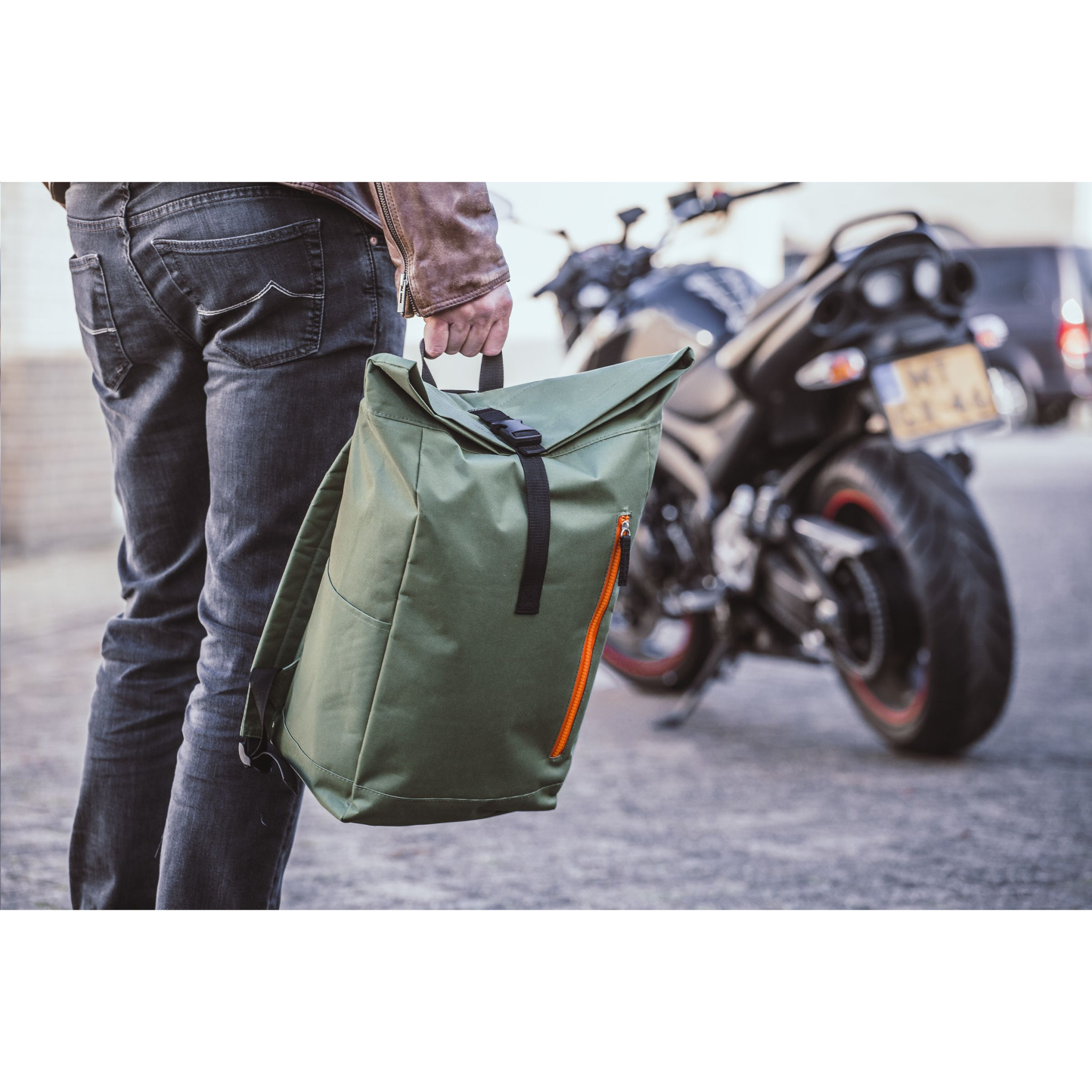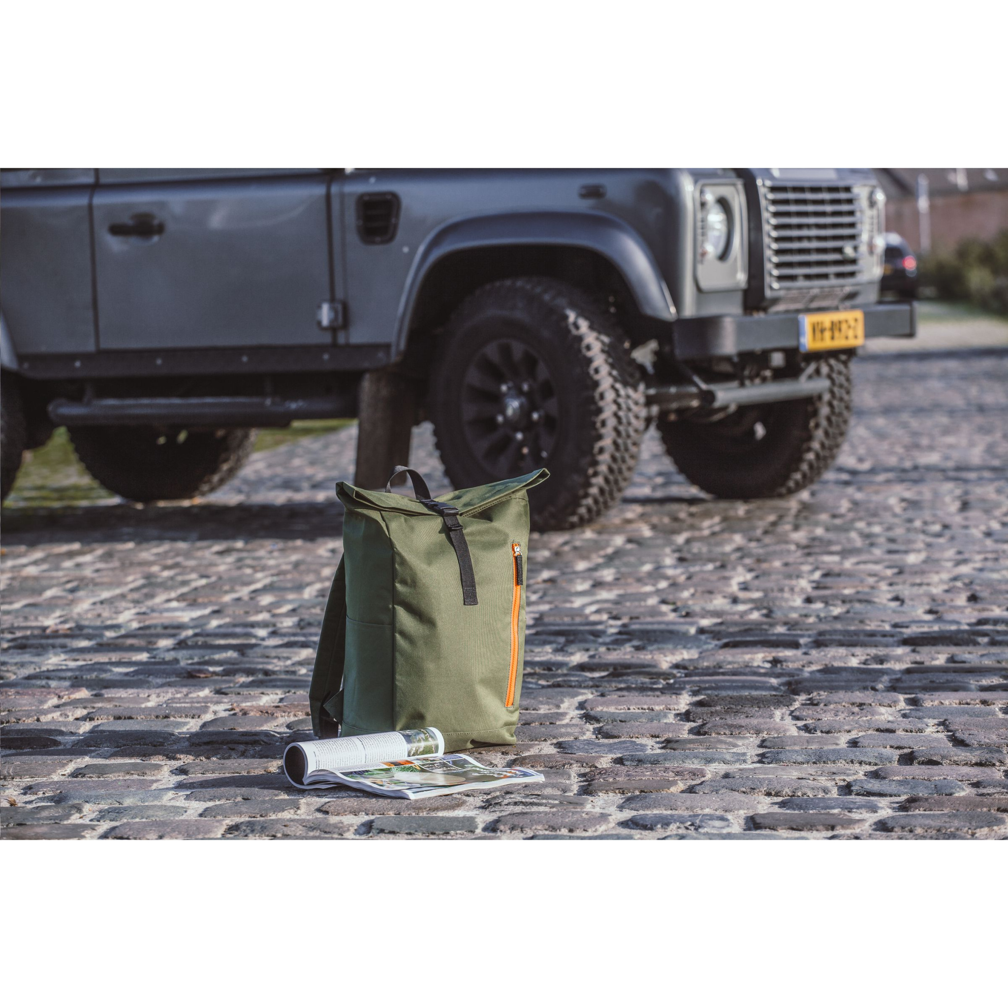 Tough, practical urban 'roll-top' backpack made from strong 600D polyester with water-resistant PVC interior, partially nylon lined. The backpack has one large inner compartment, a pocket on both sides and a large zip pocket on the front. With foam back for increased comfort, padded, adjustable shoulder straps and hand loop. With carrying strap and a roll closure with a handy click system at the top. The perfect bag for daily use. Capacity approx. 18 liters.