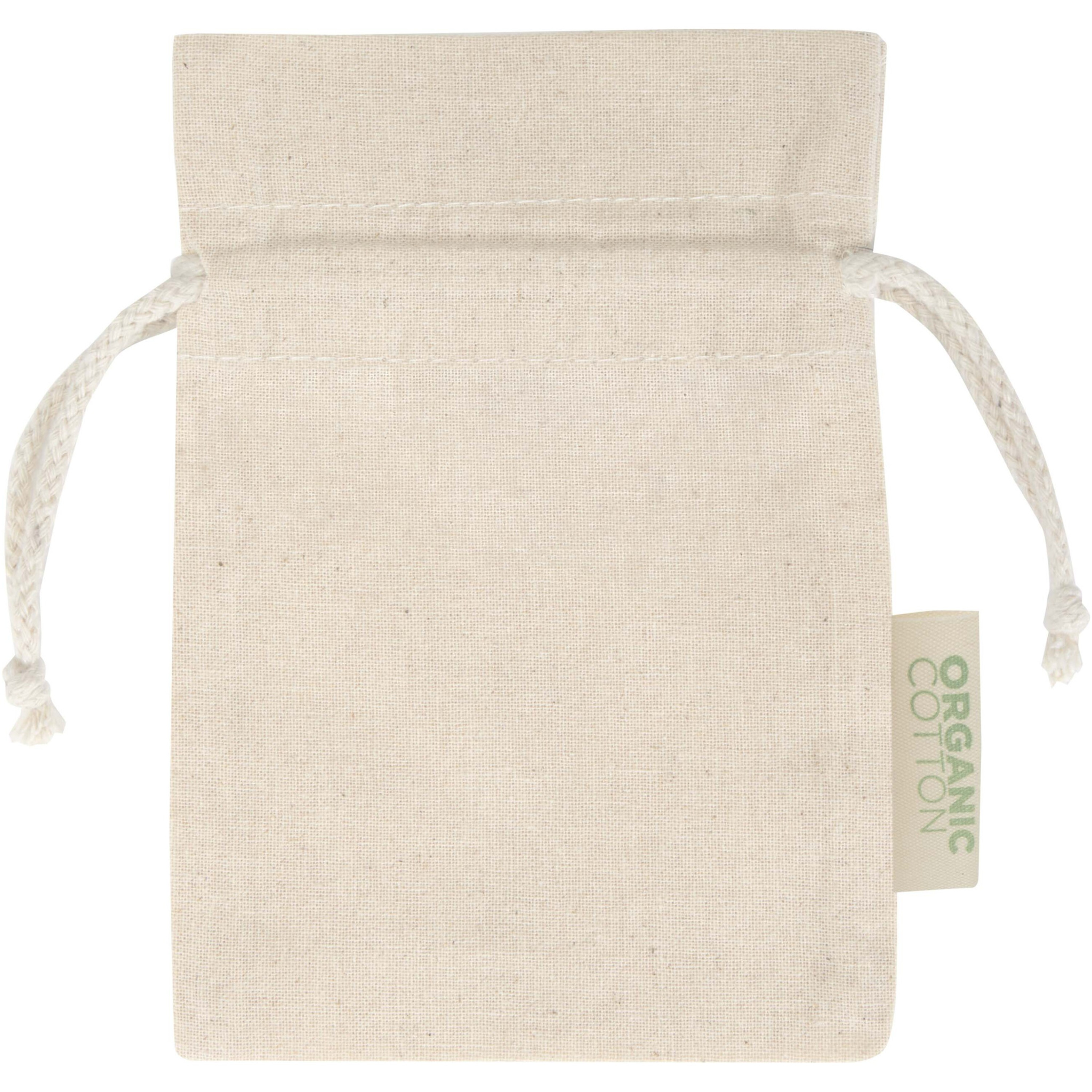 Gift bag made of 100% OCS certified 140 g/m² organic cotton featuring a cotton drawstring closure. Ideal for gifting or storing items. Size: 15 x 10 cm.