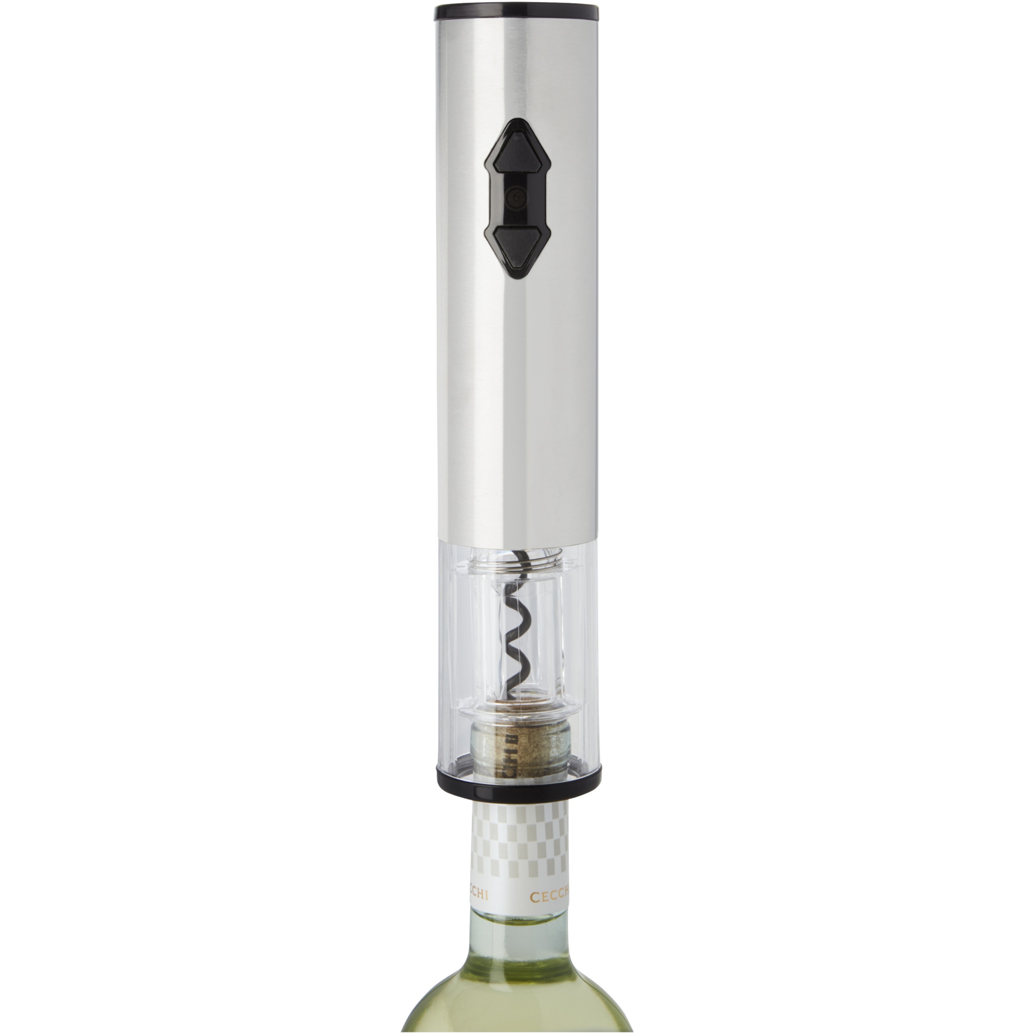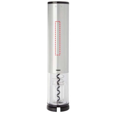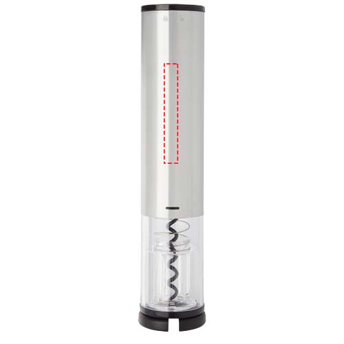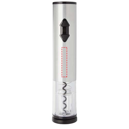 Electric wine opener in combination with a foil cutter, a pourer and a stopper. It works with 4 AA batteries (not included).