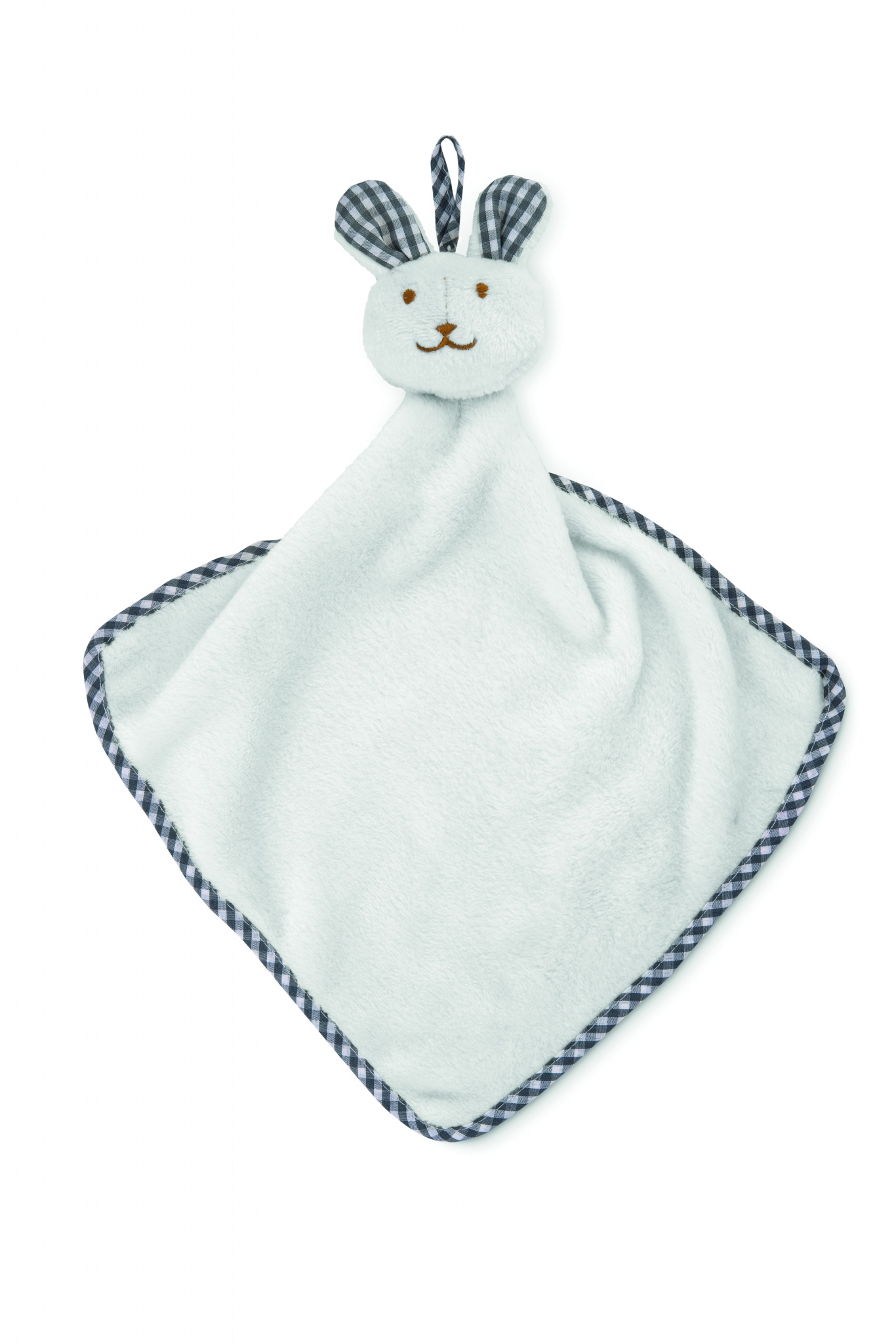 Plush baby towel in velvet polyester with rabbit design on the top. 180gr/m².