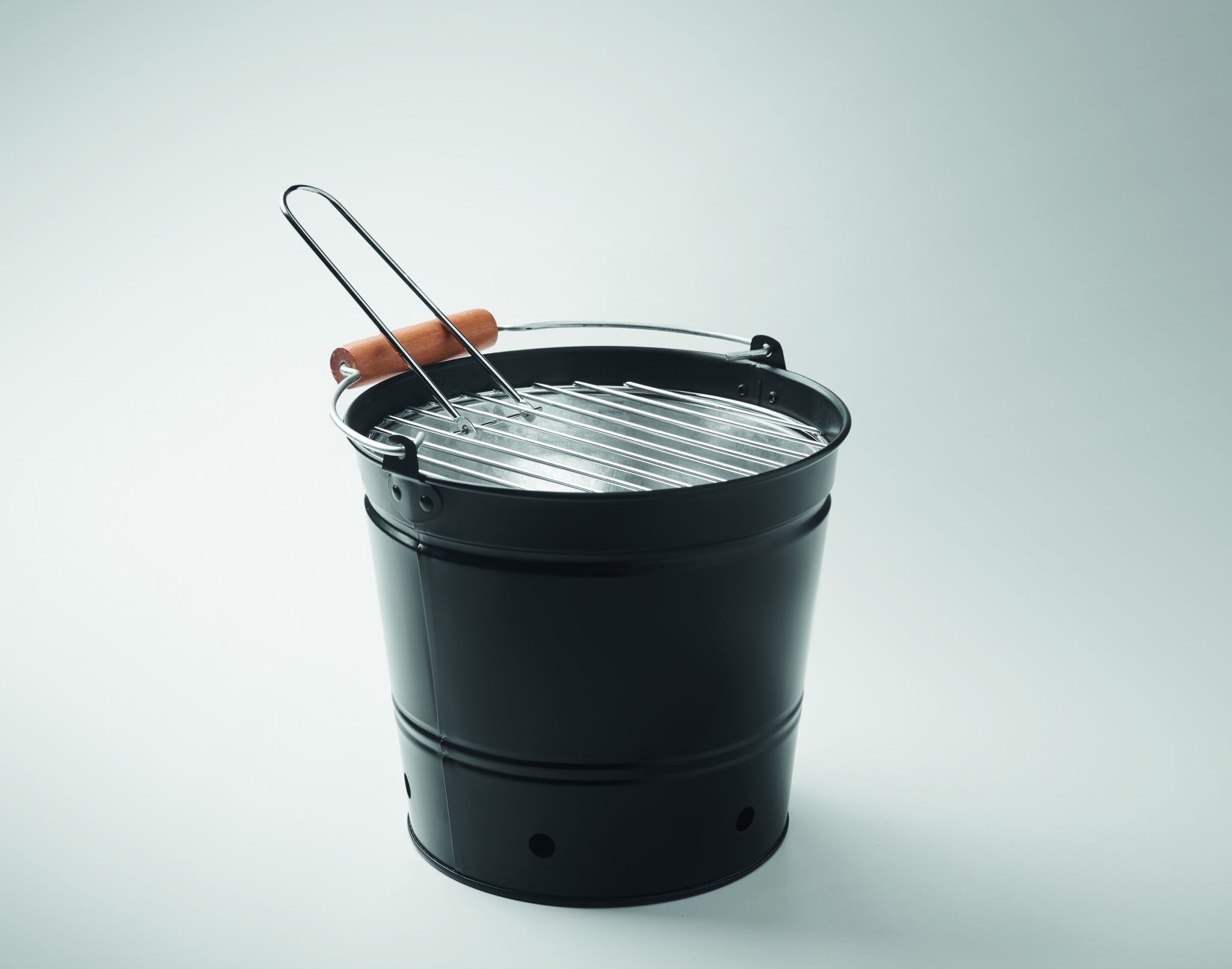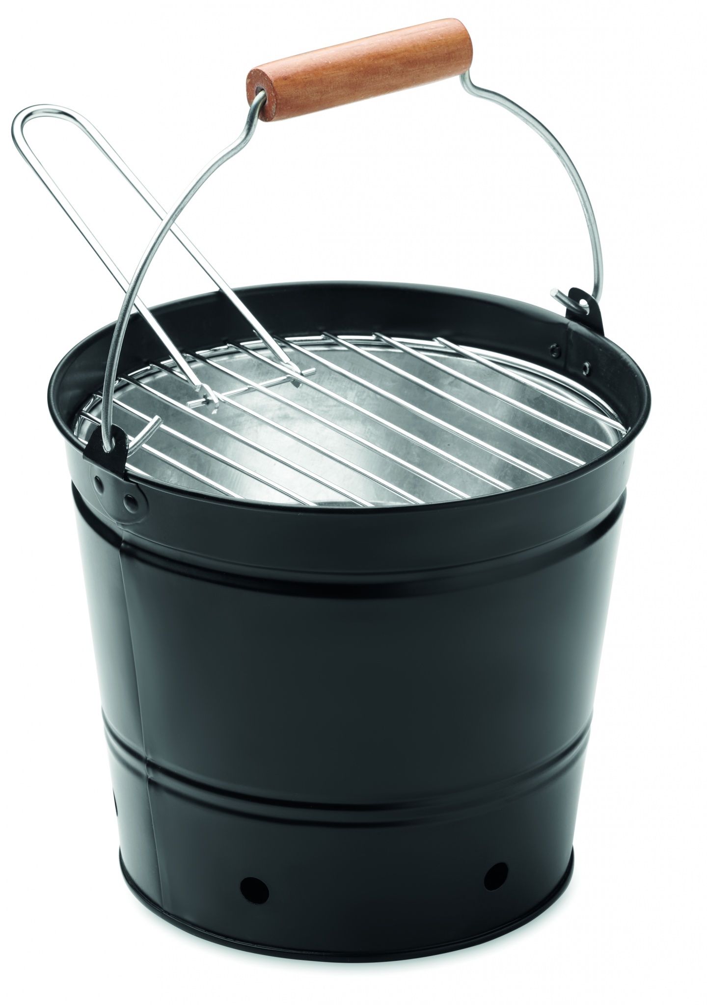 Iron portable bucket barbecue with stainless steel grill with wooden handle.