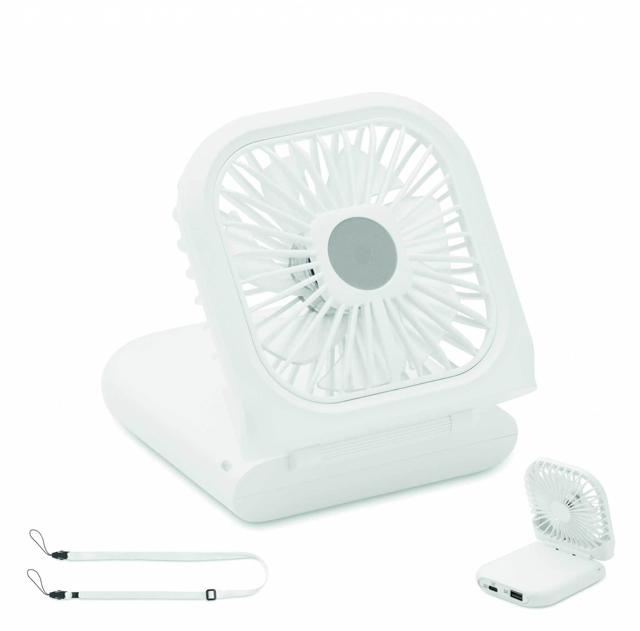Portable foldable fan with adjustable neck strap. 3 speed settings. Can also be used as desk fan when folded. Including a 3000 mAh power bank. In/Output: Type-C <(>&<)> output type A.