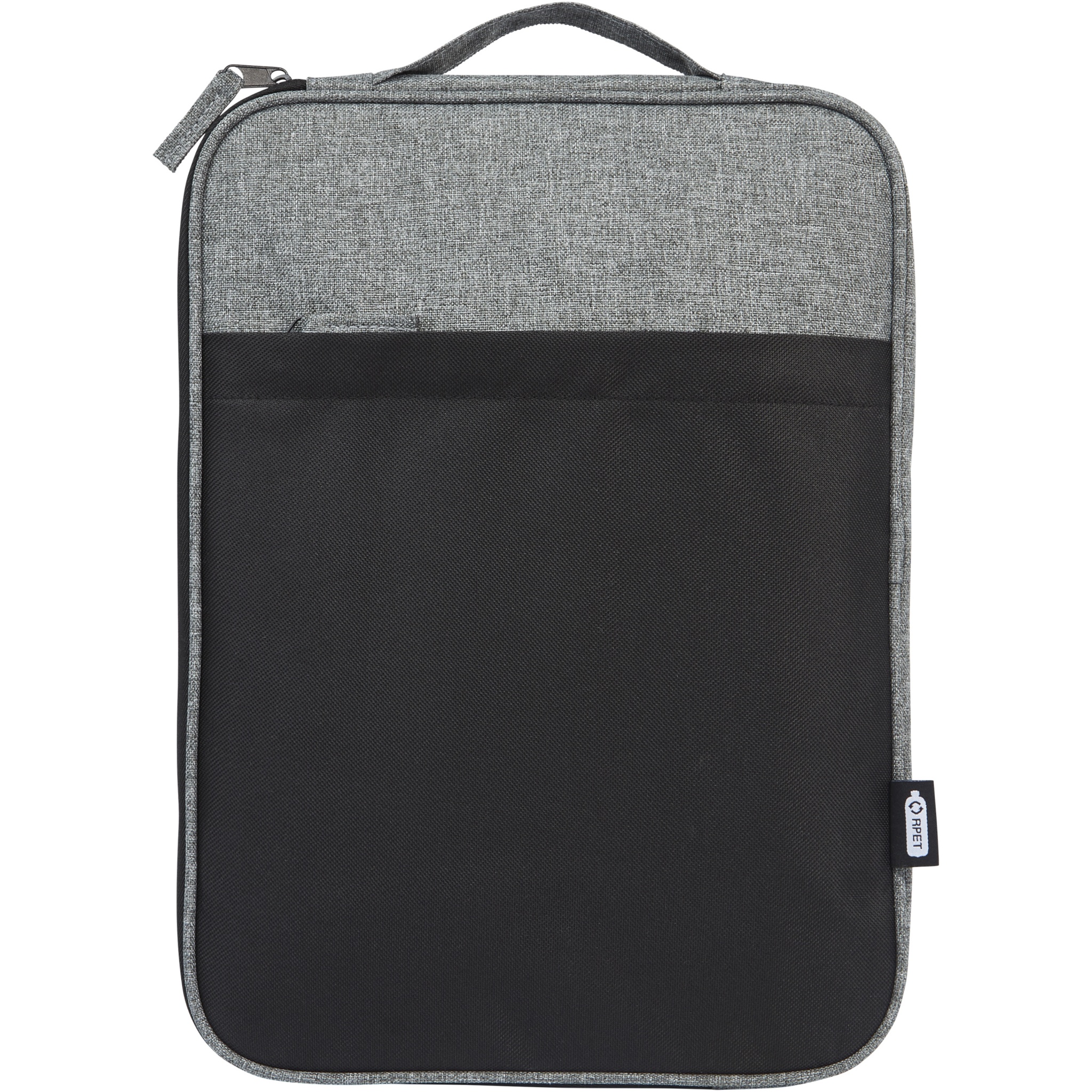 The two-tone laptop sleeve is made from 100% GRS recycled materials on the exterior, and it features a compact and protected laptop compartment fitting most 14" laptops. It also has a zippered front pocket for documents, notebooks and small accessories, and a carrying handle, making it perfect for daily commuting.