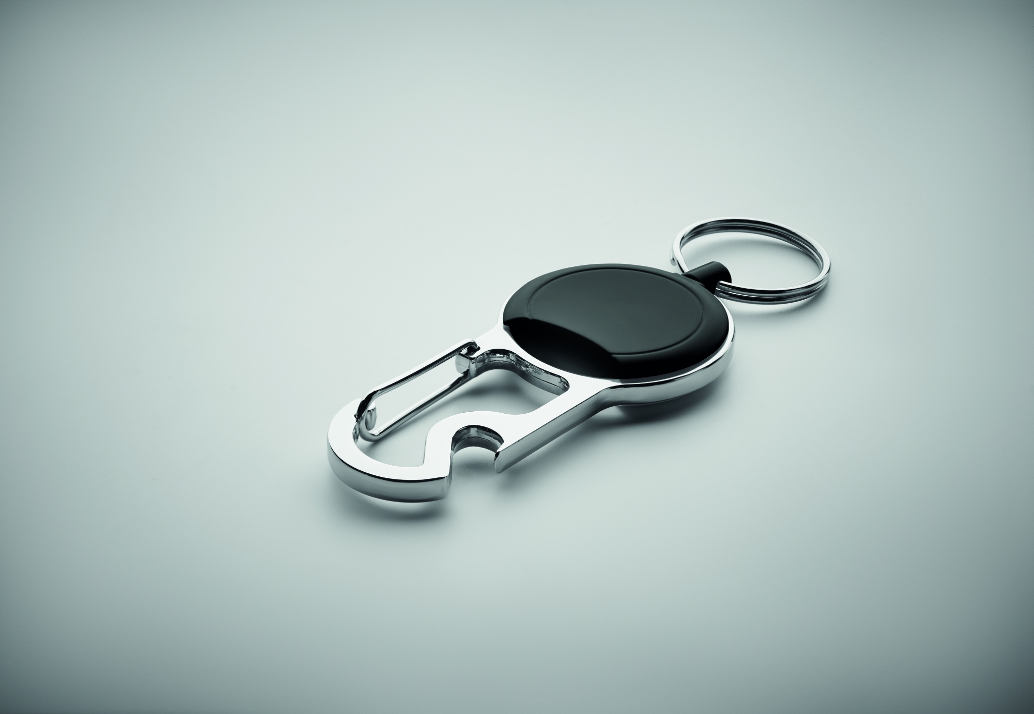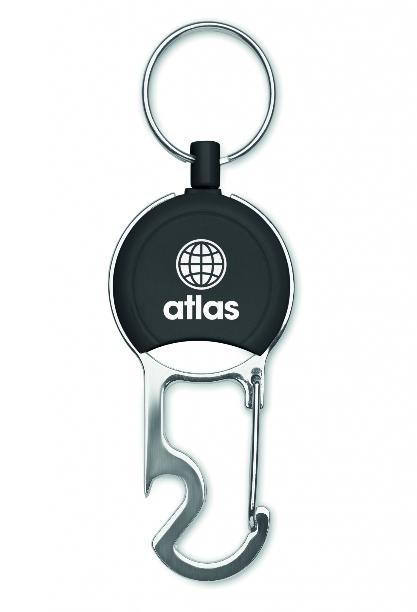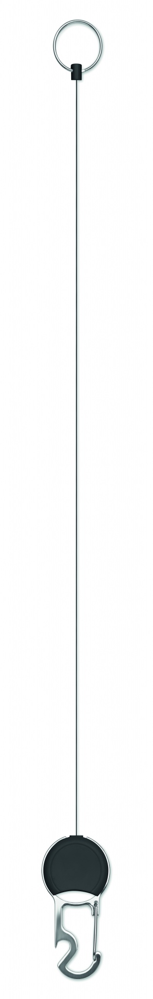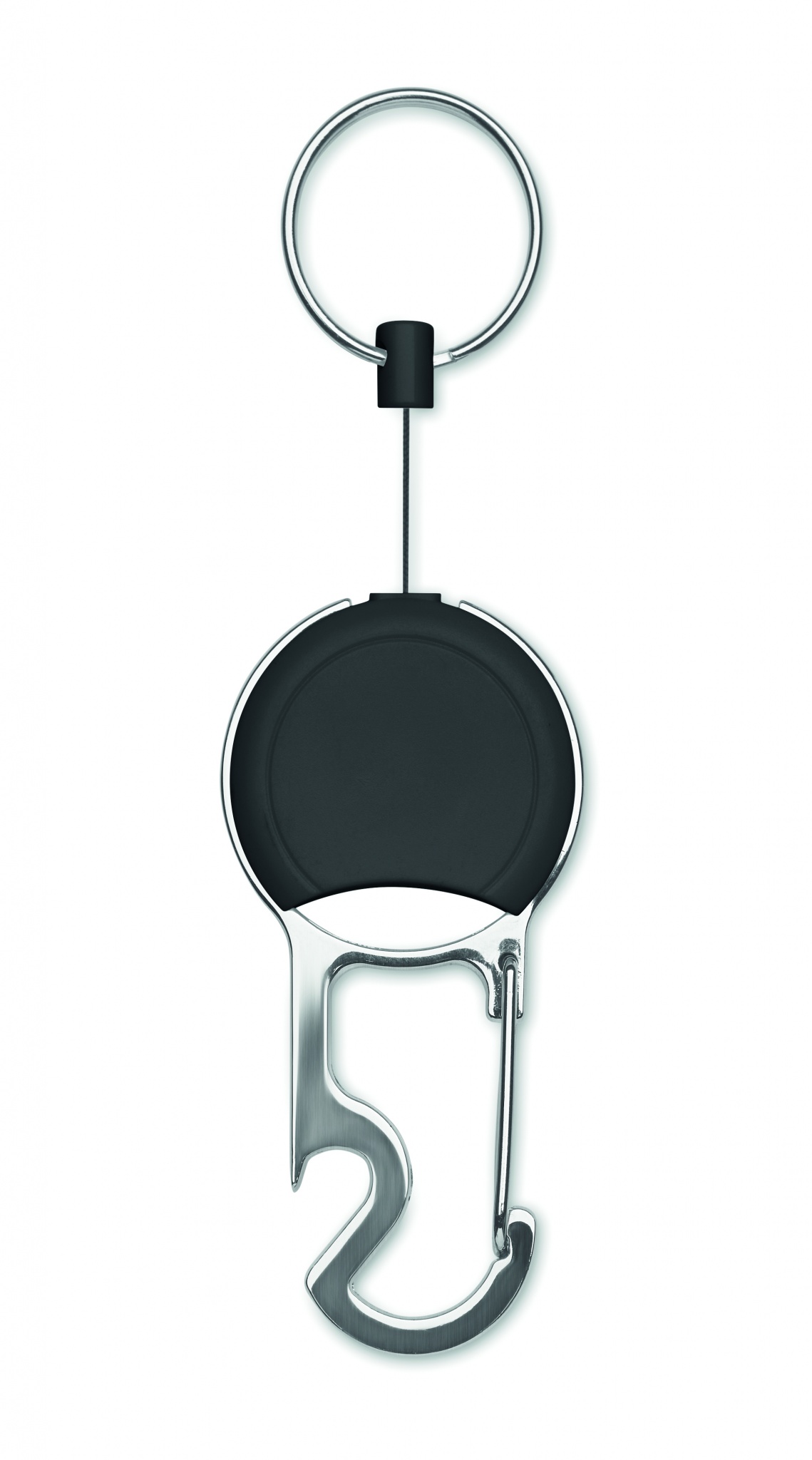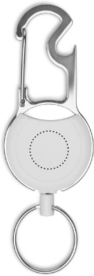 Retractable badge holder in ABS with clip, key ring and bottle opener.