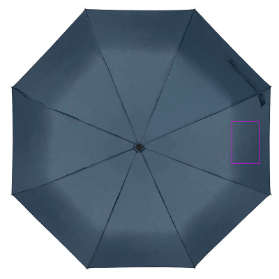 Automatic pocket umbrella with fibreglass frame, cover made of recycled PET bottles, wooden handle and wrist strap. Your logo will be printed on one segment.