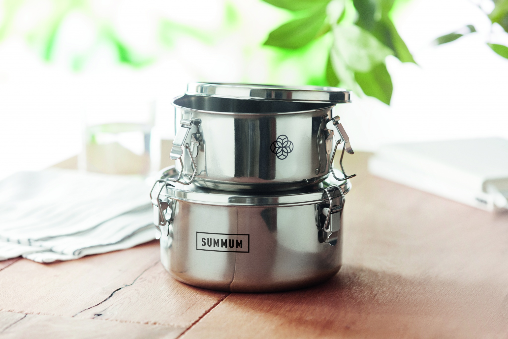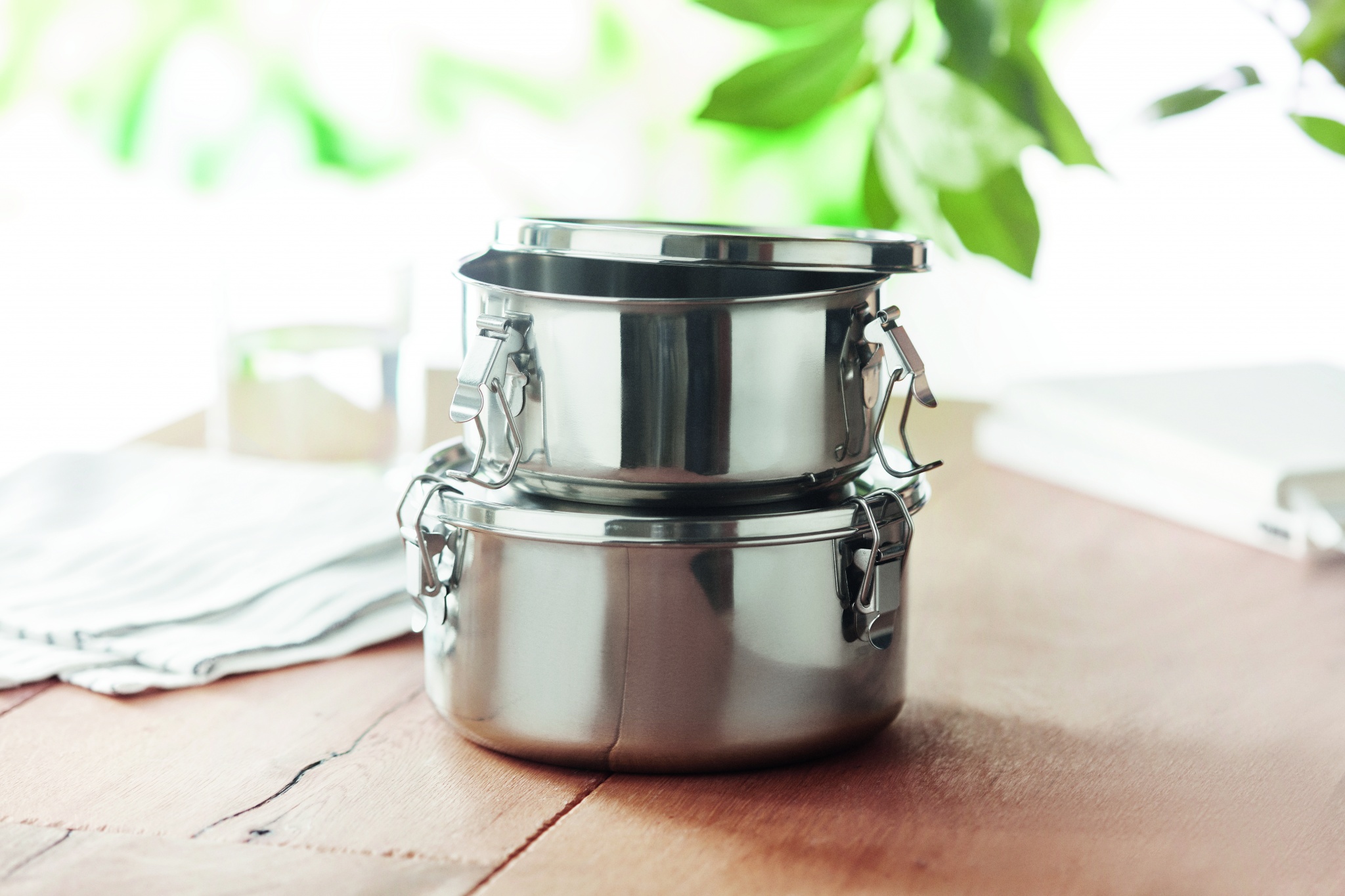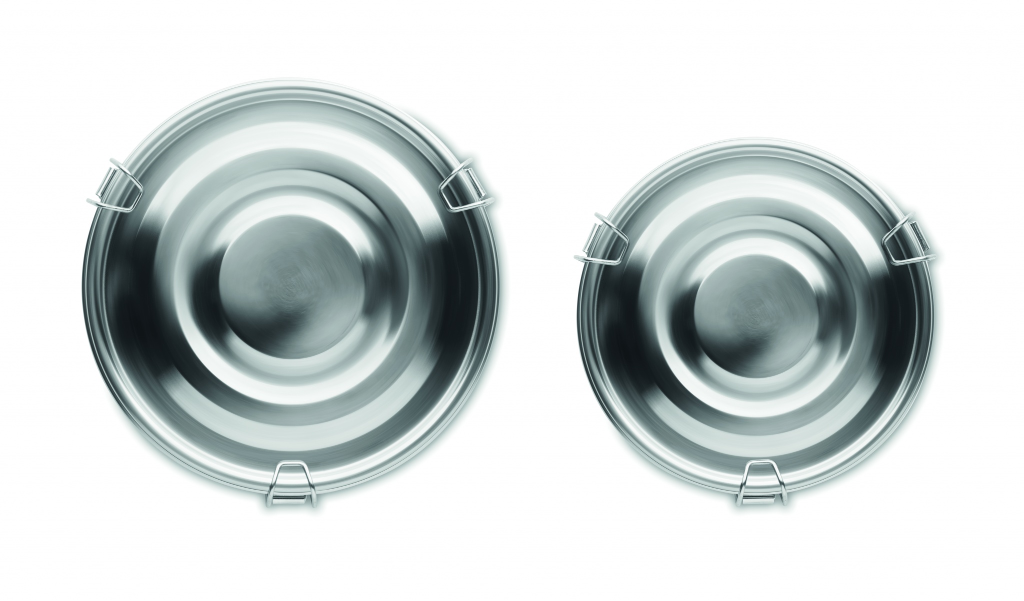 Stainless steel lunch boxes or storage set with strong and secure side buckles. Capacity: 450 ml. and 900 ml.