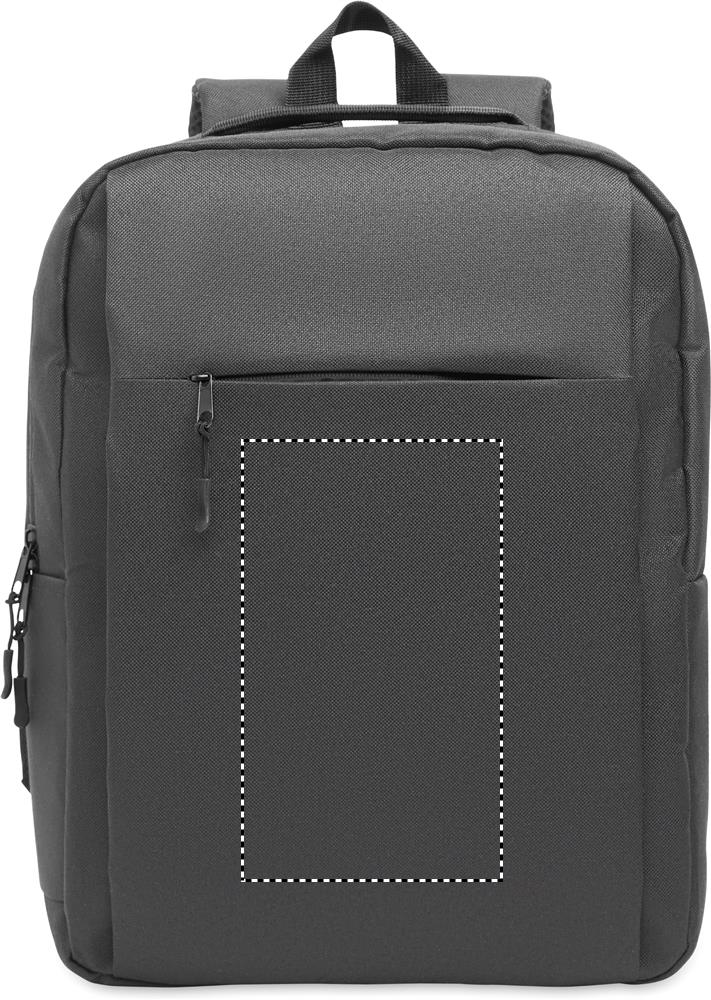 Slim backpack in 600D RPET polyester and 210D lining. Has 15 inch laptop compartment, a 10 inch tablet outside zippered pocket, 2 internal pockets, 2 internal pen pockets, zippered front pocket. 2 side pockets. Soft padded back and shoulder straps. Suitcase sleeve.